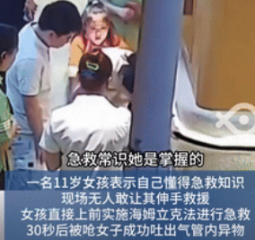 这位小女孩火了!辽宁沈阳,一女子喝奶茶时不慎被呛住,没办法呼吸,可大家却不敢贸然施救,就在这时,一11岁女孩挺身而出,起初大家还不太同意,但女孩却直接上手营救,不料,只用了30秒,便将女子给成功救回,网友:这孩子前途无量! 据小鱼视频8月11日的报道,这件事情发生在沈阳,女子在被奶茶里的“珍珠”卡住之后,便感到呼吸不上来,尝试将其咳出来,也失败了。 店里的员工注意到这个情况后,便过来询问下怎么回事,不过在了解完情况后,他们也没啥好的办法。 毕竟在场的众人,都不是专业的医生,要是随意过去救治的话,说不定还会因为操作不当,让情况变得更加严重。 也就在这个时候,有位小女孩自告奋勇站出来,表示自己知道该怎么救,但大家看到她的年龄太小,都秉持着怀疑的态度。 见状,女孩也没去解释什么,紧接着就来到女子的身边,从后面抱着她开始用海姆立克进行救治。 就这样,在过去了半分钟左右,几颗珍珠就从女子的口中吐了出来,能够自主呼吸了,成功让她脱离险境。 事后也了解到,女孩是有接受过专门培训的,好多的急救知识她都知道并掌握了,目前还是位红十字会的讲解员。 而女孩对这件事情看的也很开,并没有特意向同学们炫耀,就这份品德,相信她以后绝对能成大器。 那么对于这件事情,您有什么想说的呢?