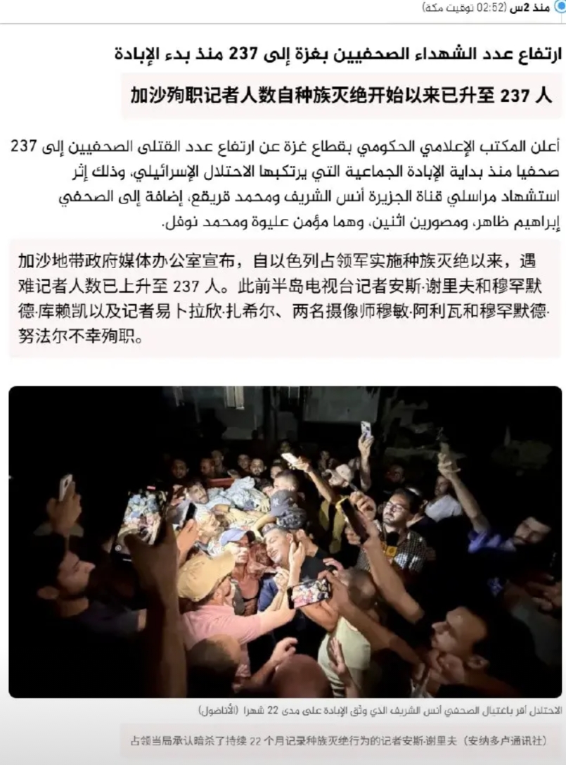 可能是预测到了自己的命运,阿纳斯生前还留下了揭开以军真面目的一段遗言,称如果自己遇害,那就是以色列为了扼杀他的声音。不仅是他,如今在加沙被杀害的记者数量已经达到了237名,结果大都被以军用“意外”或者“扣帽子”的说法和手段给敷衍了事。