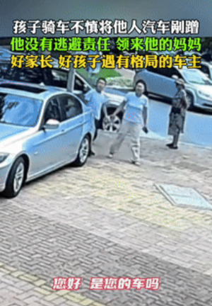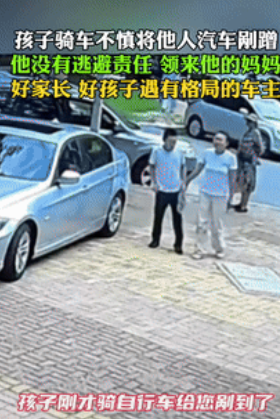 都是讲究人!辽宁,一男孩骑车时不慎剐蹭到汽车,可他却推着车直接离开了,本以为是害怕被责罚,所以就逃跑了,不料,没一会他又折返回来,身边还多了个大人,原来是回家叫家长了,在找到车主后,母子俩便主动道歉加赔偿,而车主接下来的做法,却让人很意外! 据发现大连8月10日的报道,男孩正骑着车走在人行道上,可能是一时走神,不注意蹭到了一辆车的屁股。 不过令人意外的是,随后他就推着车离开了现场,但是还没多长时间,他又折返回来,但这次他并非是自己来的,而是将自己的妈妈给叫来了。 然后母子俩就去查看下剐蹭的情况,紧接着家长就开始尝试寻找车主,主动去商谈赔偿的事情。 与此同时,在旁边店里的车主听到动静后,便出来看一下,在了解完事情经过后,看到母子俩这种解决事情的态度,当即就表示不追究了,反正剐蹭的也不严重。 见状,母子俩急忙向车主道谢,本以为这件事情到此就完结了,可没想到,后面这对母子竟主动上门。 而这次俩人手里还掂着一些水果,找到车主再次表达歉意,这一幕也让车主感到特别的暖心。 该说不说,无论是男孩和他的家长以及车主,都是很善良的人,一方在遇到问题时,没有选择逃离,反倒是积极去认错,体现了自身的好素养,而车主的做法,同样彰显了自身的大格局。