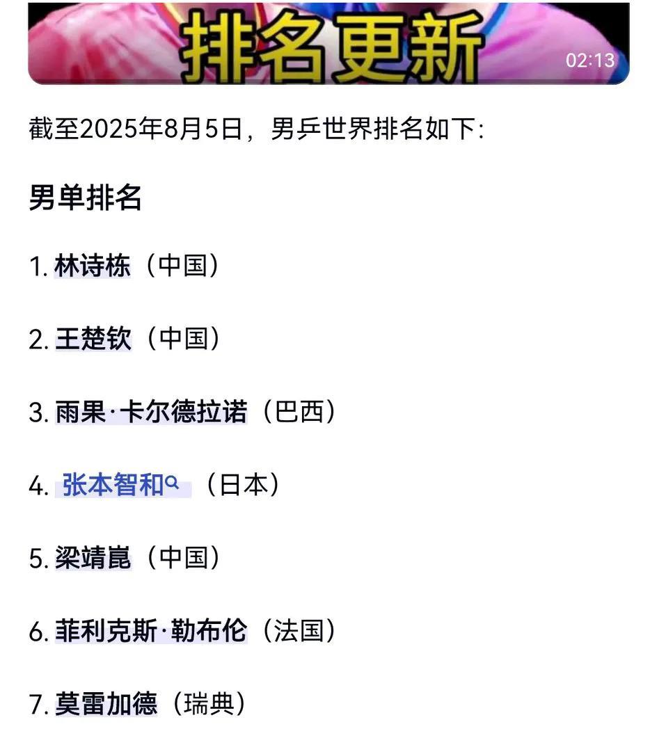 王楚钦2:4惨败张本智和,对张本8连胜被终结,痛失WTT横滨赛冠军,大头你骄傲了吗??? 世兵联冠军赛(WTT横滨赛)男单决赛,由世界排名第2的中国选手王楚钦,挑战世界排名第4的日本选手张本智和。 前3局,张本智和打的顺风顺水,大头主动失误也比较多,很快大比为0:3落后(9:11,5:11,8:11)。 第4局,大头10:7领先,追到10:9,王皓叫了暂停,大头稳住局面,11:9追回1局。 第5局,大头先得2分,之后连丢4分,追到4:4,5:5,大头连得3分,8:5,又追到8:8,9:9,10:10,11:11,异常紧张刺激,13:11再追1局,大比分2:3。 第6局,张本智和抢攻连得3分,4:2领先时叫了医疗暂停。暂停回来张本智和很快拿到10:4的冠军点,最终11:4拿下第6局。大比分4:2夺冠。 纵观全场比赛,大头可能被之前对张本智和6连胜所迷惑。太过轻敌。准备不够充分,大意失荆州啊! 赛后大头格局打开,大度的想张本智和表示祝贺。