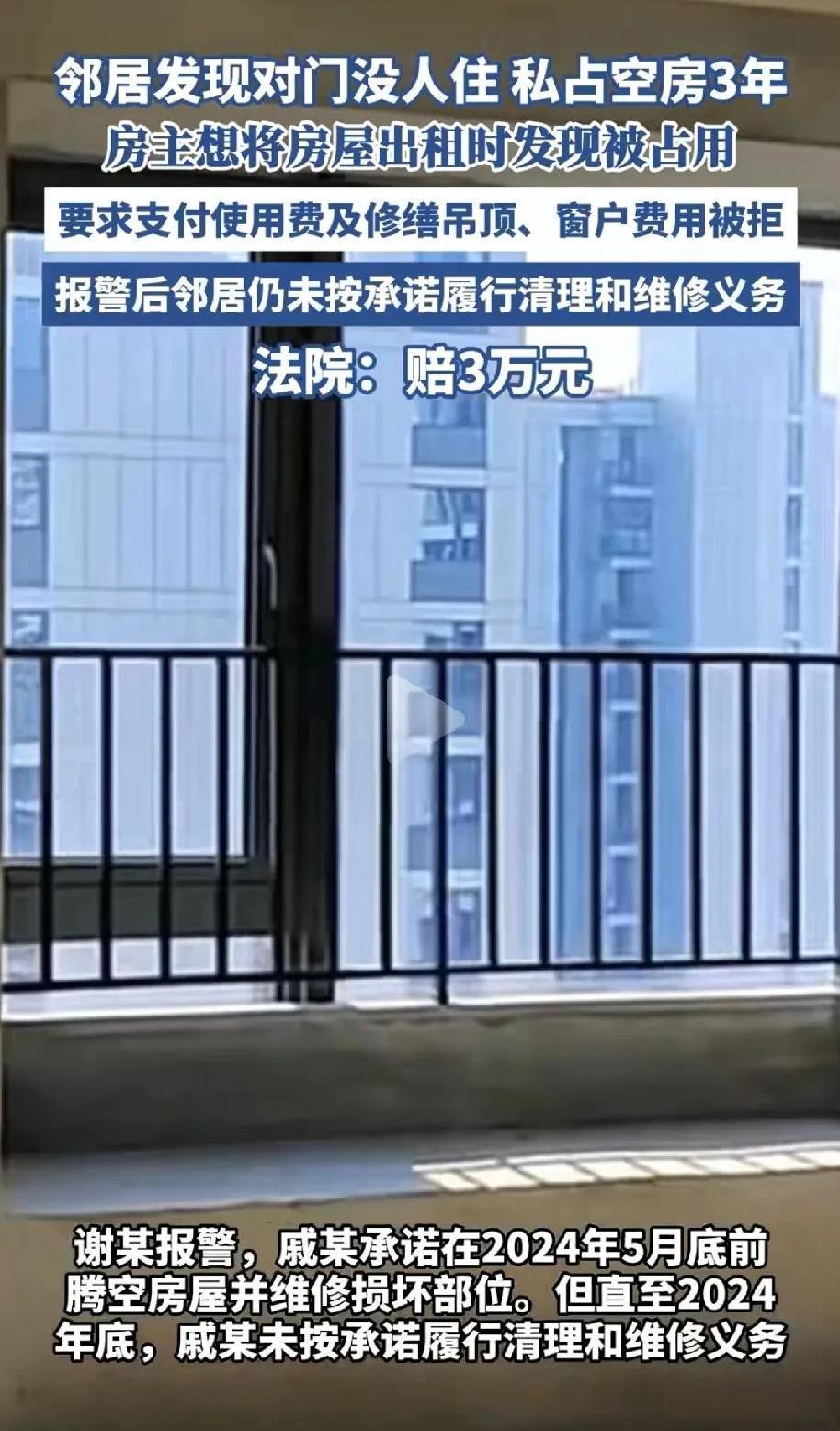 这就是贪小便宜的下场!男子3年前发现,对门邻居家房子长期空置无人居住,他为了贪点小便宜,私自占用邻居家的房子。邻居后来发现房子被男子占用,要求男子支付房屋占有使用费、维修费等3万多元。男子辩解,他这是为了避免邻居利益受损而代管房屋,属于无因管理,不应该赔偿。法院这样判! 8月10日,红星新闻报道了一则贪小便宜吃大亏的案例,引发网友热议。 得知交房的消息后,男子戚某早就迫不及待,赶紧装修,搬进了新房。 戚某从物业得知,对门邻居谢某也早就了领了钥匙,但却常年大门紧闭、无人出入。 这让戚某心里打起了小算盘,这房子长期空着,邻居应该不会来了。与其空着,还不如放点东西进去,免费利用起来。 到了2021年,戚某再也按捺不住,擅自打开了谢某家的房门,刚开始试探性的放一点闲置的物品进去,发现没问题后,他越来越大胆。 后来,戚某竟然堂而皇之地把自家一些闲置的物品搬了进去,把这里当做一个免费库房使用起来,而且一占就是整整三年。 这三年里,戚某丝毫没觉得自己的行为有什么不妥,还觉得捡了个大便宜。 原来,邻居谢某2019年收房后,他并没有马上入住,房子就这么空着,让对门的戚某钻了空子。 2024年5月,谢某打算把房子委托给中介出租出去。当他带着中介来看房时,瞬间惊呆了。 谢某惊讶的发现,自己家里堆满了对门戚某的东西,窗户还坏了,吊顶也破破烂烂的。 谢某又气又急,立刻找到戚某,要求他支付使用房屋的费用,还有修缮窗户和吊顶的维修费用,共计3万多元。 可戚某却蛮横地拒绝了,他甚至表示,他这是好心帮助谢某,担心谢某的权益受损,这才代管房子,怎么还要钱呢? 谢某多次和戚某协商,希望能和平解决这件事,但每次都无功而返。 无奈之下,谢某只好报了警。在派出所里,戚某终于承认了自己擅自占用房屋的事实,还写下了保证书,承诺在2024年5月底前把房子腾空,并且维修好损坏的部位。 万万没想到,戚某根本就没把这份保证书当回事。 到了2024年底,房子还是老样子,戚某既没有清理自己的东西,也没有维修损坏的地方。 谢某彻底失望了,2025年2月,他一纸诉状将戚某告上了法院,要求戚某支付房屋占有使用费、维修费用等共计3万元。 对此,法院会如何审理呢? 1、戚某属于无权占有房屋,应当清空房屋。 《民法典》第235条规定:无权占有不动产或者动产的,权利人可以请求返还原物。 戚某擅自进入谢某未实际入住的房屋并长期占用,属于典型的“无权占有”。 谢某作为房屋所有权人,虽未实际使用房屋,但其不动产权证已登记权属,依法享有完全物权。 值得关注的是,戚某的占有行为具有持续性,且其抗辩理由仅为“房屋空置无主”,但法律上物权归属并不以实际占有为前提。 因此,谢某有权提起返还原物请求权,并主张物权受损的经济补偿。 2、戚某存在过错,应当给与赔偿。 戚某明知房屋非己所有,仍然长期放置物品且疏于管理,对房屋损坏存在主观过失。 法院查明,谢某提交的房屋损坏证据直接指向戚某的占有行为,二者之间存在因果关系。 最终,法院判决戚某支付占有使用费及维修费用3万多元。 戚某不服气,提起了上诉,可二审法院并没有支持他,驳回了上诉,维持了原判。这下,戚某只能为自己的错误行为付出代价,贪小便宜最终吃了大亏。 关注@蜜蜂说法 ,多学法律少吃亏!