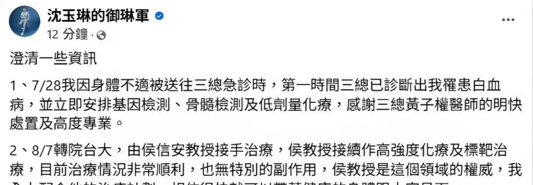 沈玉琳11日发文分享了自己的病情和治疗情况。他透露,7月28日因身体不适被紧急送
