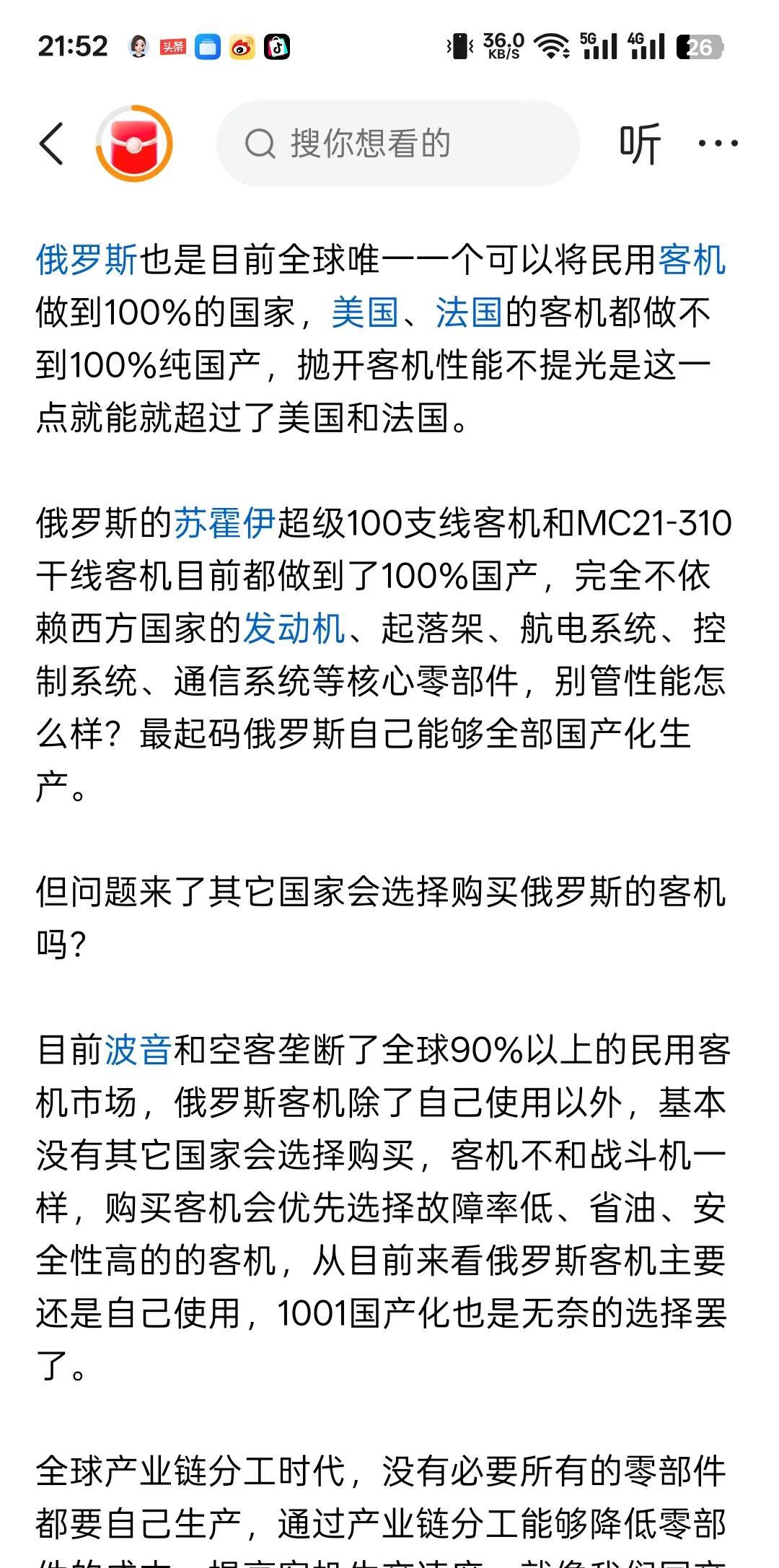 一味地追求100%独立自主制造没有任何意义,哪怕是美国这样科技强国也做不到100%全部自己制造。 比如俄罗斯苏霍伊超级100支线客机,100%做到了纯国产,包括发动机、起落架、控制系统、航电系统等核心零部件,但又能怎么样?可靠性、油耗等方面还是不如波音、空客,与其说是独立自主还不如说是无奈的选择。 现在都是分工合作取长补短,任何国家都不可能在所有的领域做到极致,比如EUV光刻机就是十几个国家共同合作的产物,然后这十几个国家都能购买EUV光刻机,这不挺好的吗?为什么非要独立自主制造呢? 现在几乎所有的高科技民用产品,几乎都是全球产业链分工合作,这也很正常,产品做好了能够卖钱就行了呗