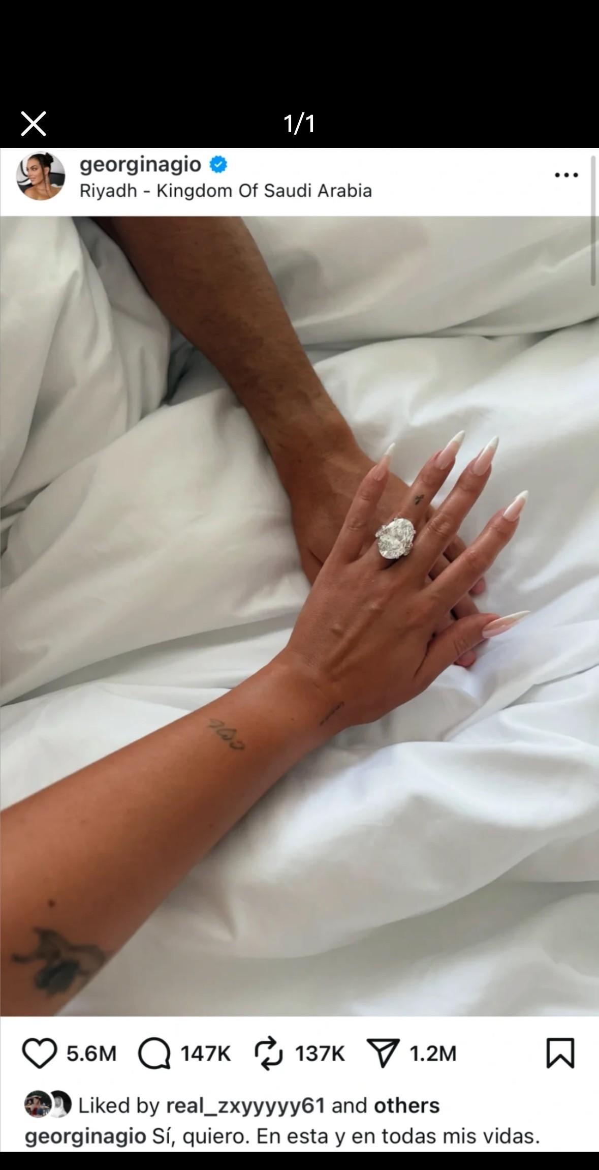 C罗和乔治娜真的订婚了啊啊啊!! 乔治娜晒的照片里,那戒指真的离谱——说鸽子蛋都