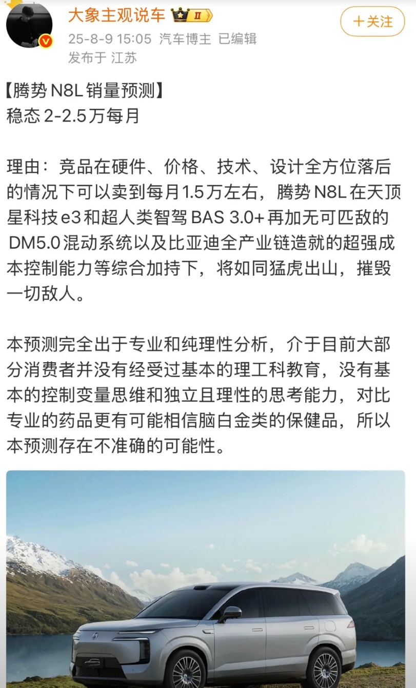 博主:“腾势N8L销量预测稳态2-2.5万台每月!” 腾势N8L:“我都回炉重造了,你还不放过我?” 好一记猛虎下山! 话说,大象是懂流量的,为了流量,居然连回炉重造的N8L都不放过,太极端了,难怪现在那么多人说他是比亚迪的负资产! 不过话又说回来,虽然大象确实极端了点,但人家也是真金白银支持比亚迪的,仰望U8、腾势N7、方程豹豹8,这都小200万了吧?