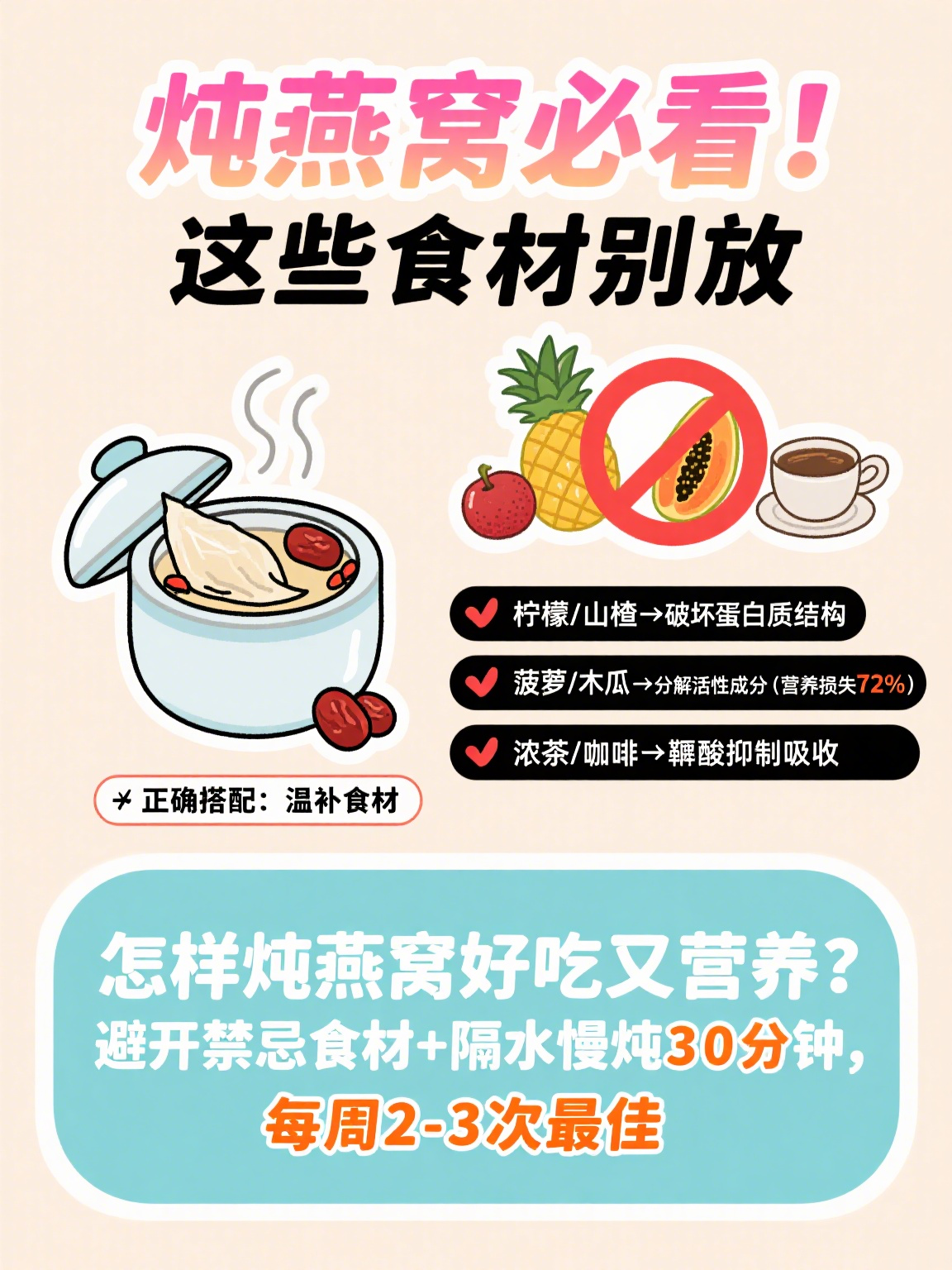 柠檬、山楂→ 破坏蛋白质结构;菠萝、木瓜→ 分解燕窝活性成分,营养损失72%;浓茶/咖啡:鞣酸抑制营养吸收。
