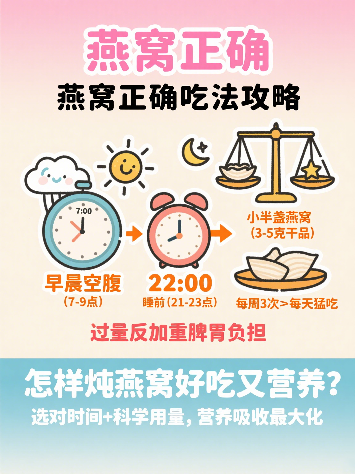 早晨空腹(7-9点)或睡前(21-23点),胃酸分泌少,营养直抵小肠高效吸收;成人每次干燕窝3-5克(约小半盏),每周3次比每天猛吃更有用!过量反加重脾胃负担。
