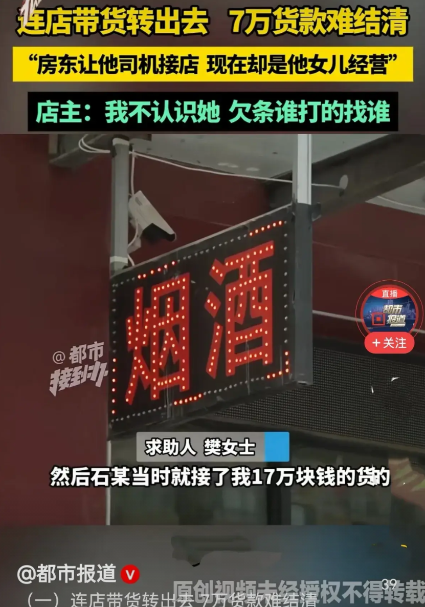 河南,女子经营烟酒店3年3个月时,房东突然说他的司机想干,让女子转让出来。经商议女子连店带货17万转出。司机与她签了转让合同,当时支付了10万,欠7万尾款。可一年多了,尾款未收回,可司机说他已不经营,是房东女儿经营,让去店里找他们。可店主却说不认识她,女子联系房东,被房东一顿臭骂,女子傻了,这钱到底谁来还啊?