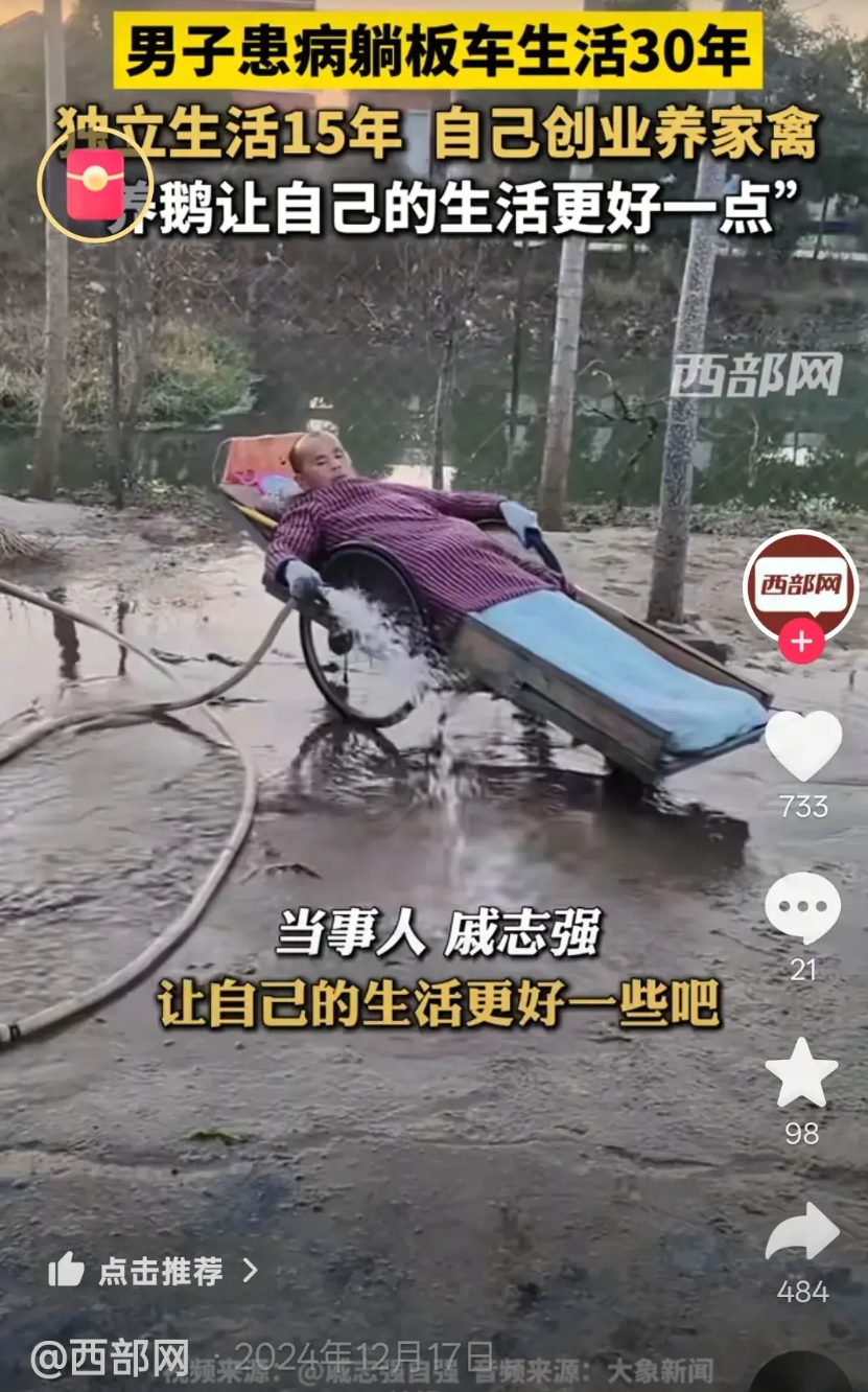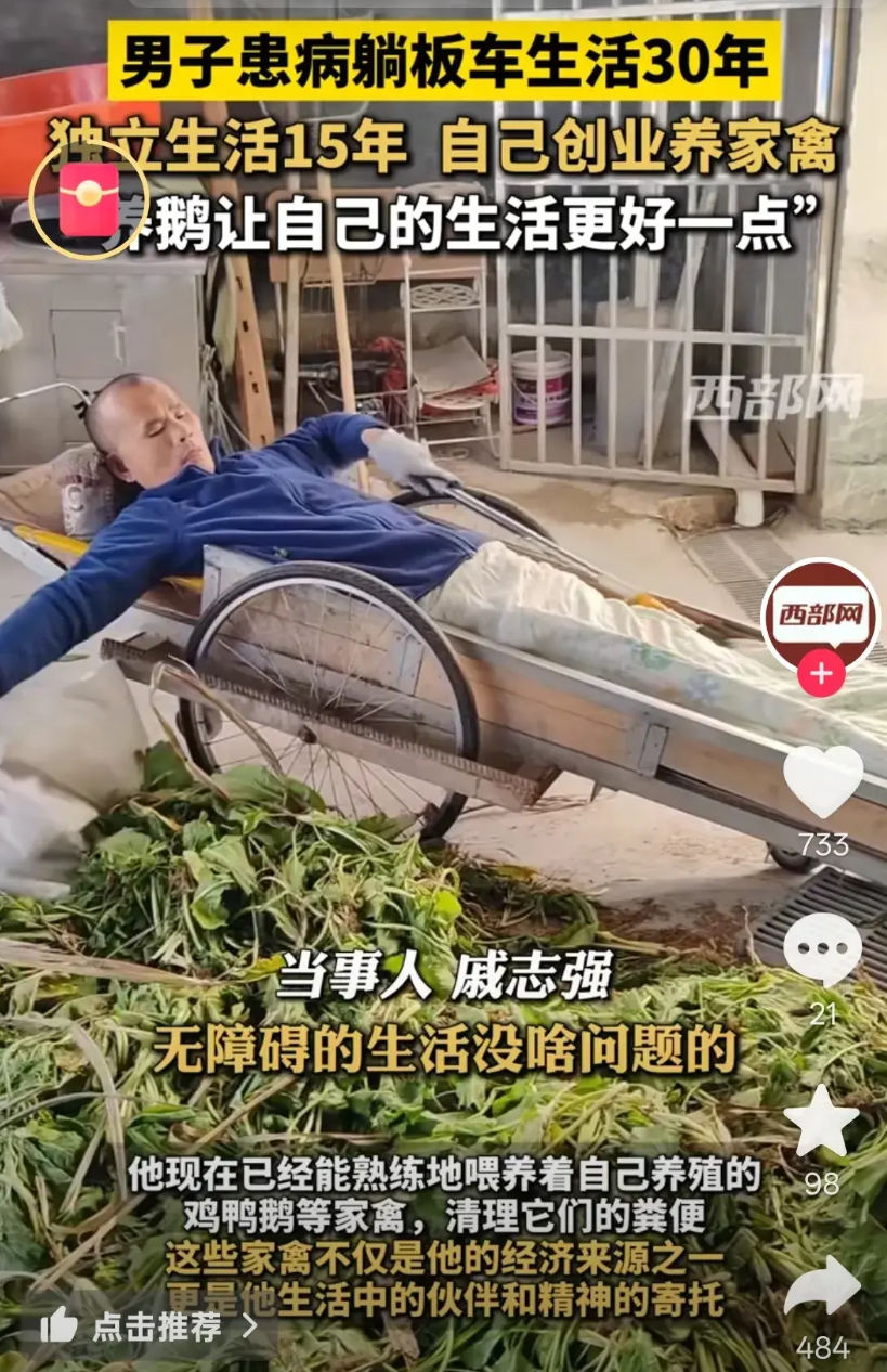 河南周口,47岁的男子-戚志强, 瘫痪在板车30年,独立生活养鹅15年, 他是如何做到的呢? 戚志强十多岁就被确诊为强直性脊柱炎丧失了独立行走的能力, 命运向他开了一个玩笑,但他并没有低头,他开始用自己自制的小板车作为自己的双腿,重新学习,在家中和床上移动。 板车上,侧面看不清的地方他试着用镜子的反光看。 他现在能够熟练的养鸡、鸭、鹅,给它们喂食,清理,都靠自己完成。 正如他所说:“生活困难时,就尽力去熬,熬,就可以从困难中熬过来。” 我们正常人总抱怨生活不公,但对比“戚志强”我们多么幸运,让我们怀着梦想,用“熬”的苦劲,走出一番新的天地吧! 给身残志坚的“戚志强”点赞