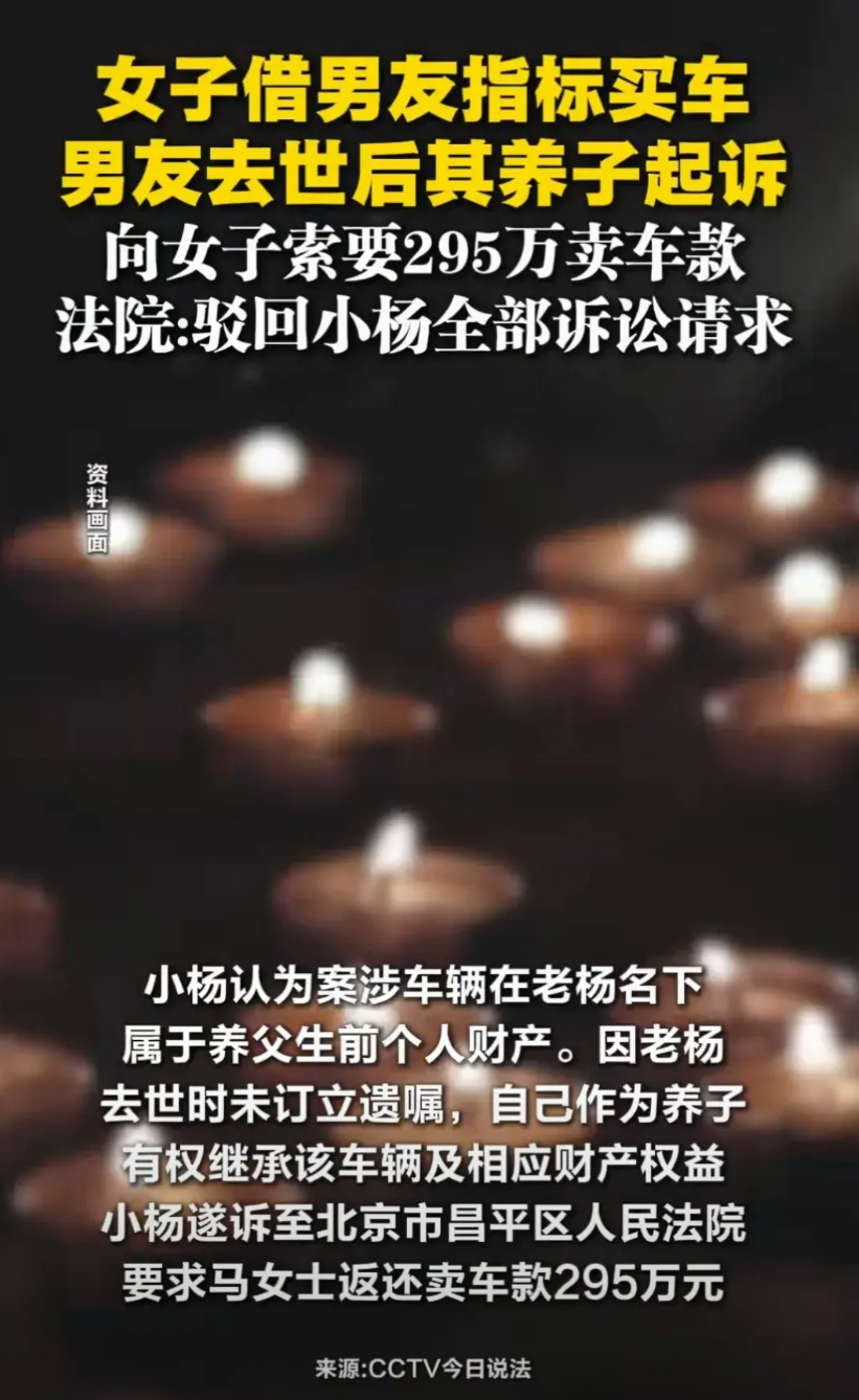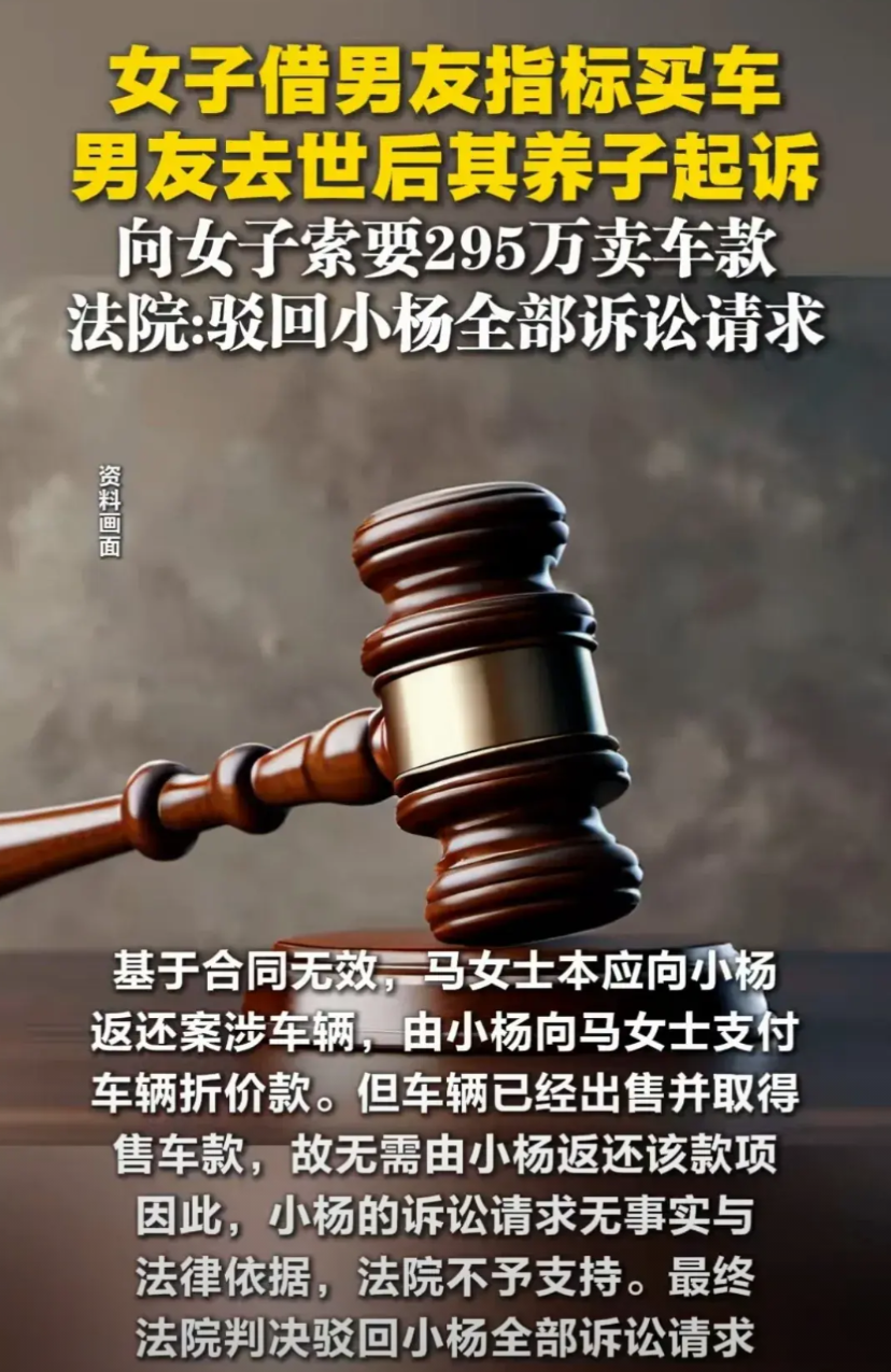 北京,男子离婚后又找了一个女友,两人同 居在一起,女友借用男子的购车指标,自己掏钱570万买了一辆豪车,登记在男子名下,男子去世后,女友将车卖了295万。男子的养子跳出来,说车在养父名下,由他继承遗产,起诉到法庭,要求养父女友返还卖车的295万。得不到,就说养父女友借名买车违法,法院判决,令养子当场打脸!