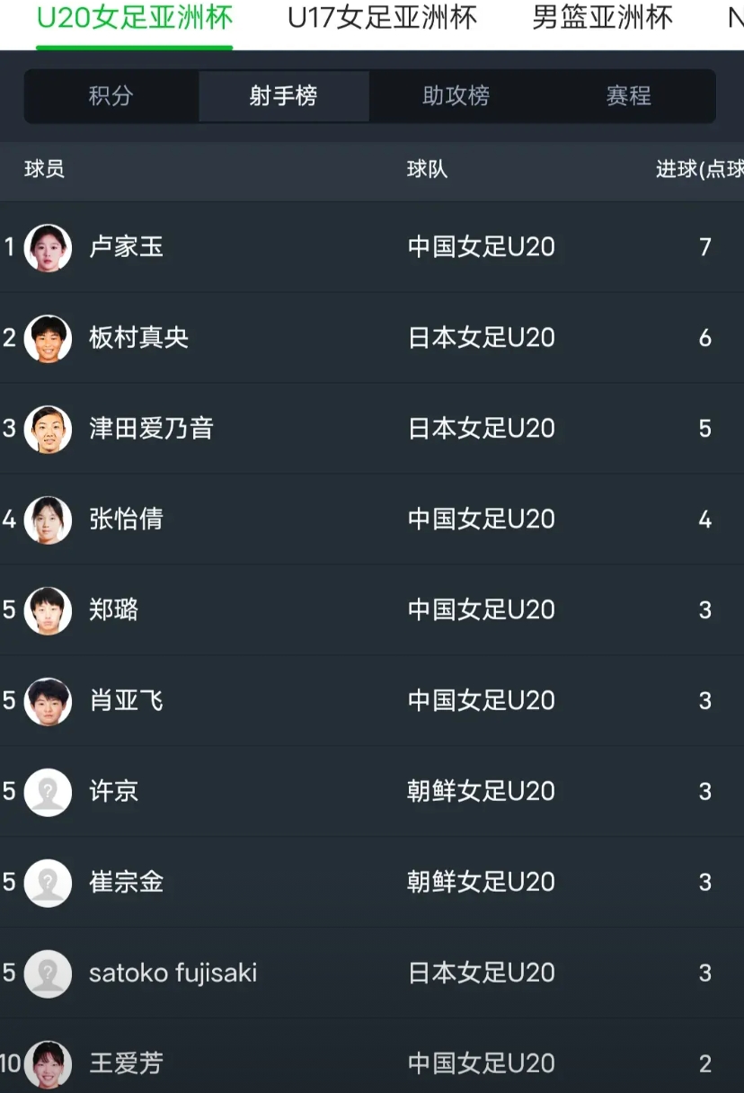 卢家玉、张怡倩、郑璐、肖亚飞、王爱芳是本次亚洲杯预选赛射手榜上的前十强,毋庸置疑