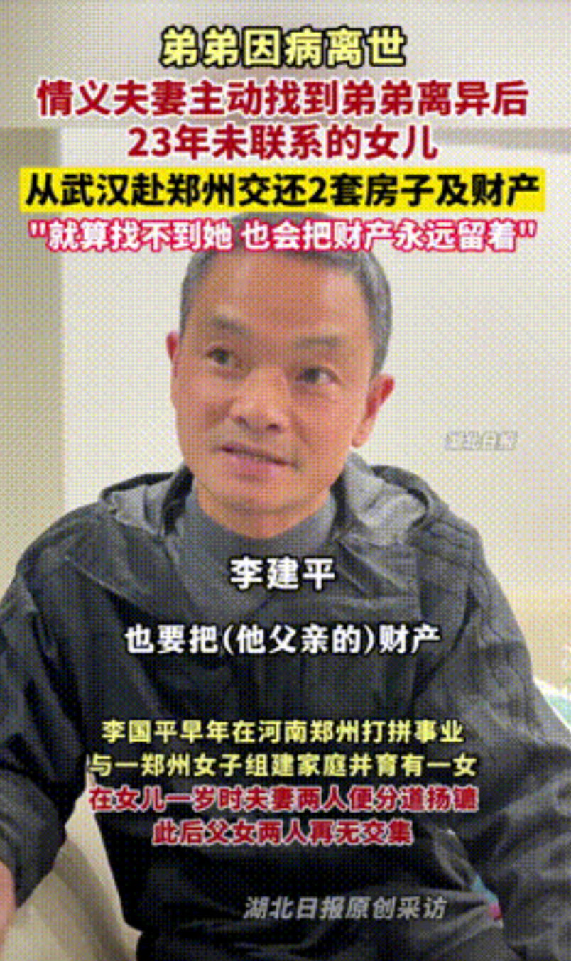 “这种人品全国罕见!”湖北武汉,一男子离异后1岁女儿判给前妻,从此再无交集!23年后,男子因病去世,留下一大笔存款和两套房子。家中商议后,决定让男子哥哥继承全部遗产,谁知男子哥哥言辞拒绝,坚持要将遗产交到素未谋面的侄女手里。网友:人间自有真情在! 上世纪90年代末,湖北的李国平离开家乡武汉,到河南郑州闯荡,在郑州开始从事建材生意。 而在郑州打拼的那段时间,李国平认识了一位当地女子,两人相爱成家,结婚一年后女儿小李出生。 可就在女儿刚满一岁时,夫妻二人产生了诸多矛盾,李国平想要带着妻女回到武汉发展生活,可妻子却不愿离开郑州,最终夫妻二人选择了离婚,小李则归妻子抚养。 此后,李国平离开郑州回到武汉,与女儿的联系彻底中断,此后23年再无联系。 回到武汉的李国平,将精力投入到事业中,直到2024年4月21日,李国平因病离世。 李国平生前在蔡甸城区购置了一套住房,后来这套房子因拆迁,置换得到一套140平方米的商品房,此外他在老家也留有一处老宅。 由于李国平生前未留下任何遗嘱,他的身后事与遗产分配,成了一个大问题。 李国平的父母早已过世,与他血缘关系最近的亲人,是哥哥李建平。 考虑到李国平与女儿已失联23年,期间从未有过任何往来,家族中不少人提出,将李国平留下的两套房产和存款,交由李建平及其子女继承。 没想到李建平竟然放弃了这个天大的便宜,他严词拒绝了这个提议,他弟弟的遗产理应归弟弟的女儿,就算23年没联系,血脉亲情也断不了。 因为李建平态度态度坚决,家族的长辈也拿他没有办法,最终也只能由他去了。 在那之后,李建平踏上了前往河南郑州的寻亲路,而在出发前,他们手中的线索少得可怜,只知道侄女生活在郑州,连侄女的名字是否更改、弟妹是否再婚都一无所知。 李建平只能先从弟弟当年在郑州的工作单位查起,可惜时过境迁,单位早已搬迁改制。 之后他又找到当年弟弟一家居住的社区,却被告知那片区域早已拆迁改造。 因为实在找不到侄女一家的下落,最终李建平只能求助警方,在警方的协助下,李建平调取了相关户籍信息,一点点排查筛选。 功夫不负有心人,在民警的帮助下,他们得知弟妹早年前因意外去世了,侄女一直由她的姨母抚养长大,如今在郑州一所大学读大四,正在实习。 循着这条线索,李建平最终找到了侄女小李(化名),而在见到侄女的那一刻,李建平的泪水止不住的流了下来。 在与侄女的交谈中,李建平得知小李对父亲的记忆几乎为零,只从姨母口中零星听过“爸爸是武汉人”,连父亲的名字都不清楚,更不知道父亲已经离世。 突如其来的消息让她有些茫然,她从未想过,会以这样的方式“认识”父亲。 由于当时小李忙于实习,李建平和侄女约定,暑假时让她回武汉办理遗产继承手续,也看看老家的亲人。 由于小李与父亲的户籍早已分离,办理继承需要公证,在7月9日,蔡甸公证处受理了她的申请,工作人员仔细审核了亲属关系证明、寻亲过程材料等,最终确认了她的法定继承权。 8月7日,小李带着公证书,在蔡甸区市民之家不动产窗口顺利完成过户,正式继承了索河老家的老宅和蔡甸城区的商品房。 在接受采访时,小李说两次武汉之行,对她而言意义远超遗产本身。 在老宅里,她第一次看到父母的结婚照,照片上的父亲年轻英挺,母亲笑容灿烂,而在清点父亲留下的遗物时,她发现了一沓泛黄的照片,全是母亲年轻时的照片,父亲一直保存着。 李建平在当天还给她准备了一个特别的礼物,那就是当年弟弟婚礼的录像带!他将当初的录像带翻录成光碟送给了小李,让她第一次看到了父母婚礼上的样子。 在继承房屋的当天晚上,家族里的二十多位亲戚聚在一起,为小李举办了欢迎宴,现场令人感动不已。 对此,大家又是如何看待的呢?