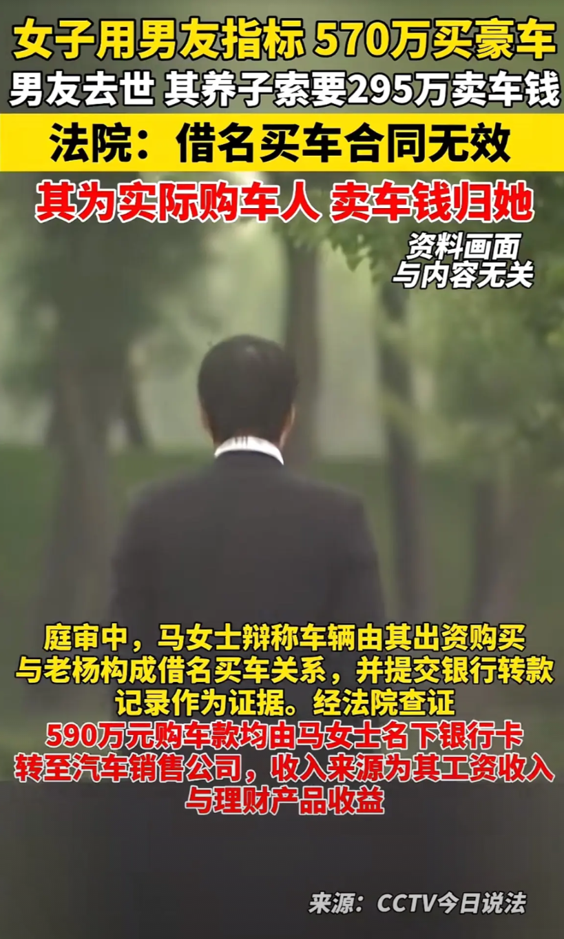 北京昌平,女子用男友的指标购买570万豪车并登记在男友名下,3年后男友过世,女子将车以295万卖出,男友养子以继承人的身份起诉女子返还卖车款。法院查明570万均是女子出资,法院这样判决! 据闽南网8月11日报道,借名买房买车后,涉及到继承问题,该如何确认权益归属,北京市昌平区人民法院给出答案。 2015年老杨突然过世,身为女友的马女士很是伤心。虽然二人并无法律意义上的夫妻关系,但毕竟同居多年,不是夫妻胜似夫妻。 马女士跟老杨共同生活多年,两个人有很多共同的财产,包括用老杨的指标购买的那辆价值570万的轿车。 马女士怕睹物思人,决定将那辆车折价卖出去。因为使用3年多,车辆也不保值,最多能卖295万元。 马女士不为了挣钱,只想着能够尽快走出阴霾,毕竟日子还要继续过,所以就以295万将车卖出。 车前脚刚卖,后脚老杨的养子就上了门,不知道从哪听说了老杨过世的消息,前来争夺遗产了。 马女士不是老杨的再婚妻子,所以没有任何继承权。小杨虽然是老杨跟前妻领养的养子,但却是老杨唯一的合法继承人。 马女士不跟小杨争夺遗产,她在跟老杨过日子的时候就分得很得挺明白的,所以小杨需要她协助什么,她都很配合。 但是让马女士没想到的是,小杨居然质问那辆豪车的去处。马女士本是一愣,然后说车卖了,卖了295万。 小杨说那车写的是老杨的名字,属于老杨的个人财产,马女士没权卖,就算卖了也没权利收钱,小杨让马女士归还295万卖车款。 马女士震惊了,这车其实跟老杨一点关系都没有,她跟小杨解释道: 因当初购车时是需要有购置指标的,但是马女士并没有,恰巧老杨有。反正都同居在一起生活了,用谁的名字买都一样,于是就用了老杨的指标买车。 虽然名字写在了老杨名下,但是钱可是马女士出资购买的,所以这车是属于马女士的。 可小杨却不这样认为,他认为既然是老杨名下的车子,那么就应该属于是遗产,应该按照遗产进行分配,而不是由马女士就这样卖掉。 马女士当然不同意这样的说法,拒绝归还卖车款。双方协商不成,小杨就把马女士告上了法庭,要求归还卖车款295万元。 小杨的主张是,老杨身故后,老杨名下的所有财产都应属于是遗产,应该按照遗产进行分配。 根据《民法典》第1127条的规定:遗产按照下列顺序继承: (一)第一顺序:配偶、子女、父母; (二)第二顺序:兄弟姐妹、祖父母、外祖父母。 继承开始后,由第一顺序继承人继承,第二顺序继承人不继承;没有第一顺序继承人继承的,由第二顺序继承人继承。 本编所称子女,包括婚生子女、非婚生子女、养子女和有扶养关系的继子女。 本编所称父母,包括生父母、养父母和有扶养关系的继父母。 小杨虽然跟老杨没有血缘关系,但是却有收养关系。只不过在老杨跟前妻离婚时,小杨跟随母亲生活,但并不妨碍小杨是老杨养子的事实。 老杨生前并未立有遗嘱,而且离婚未再婚,小杨是老杨的唯一继承人。所以小杨以继承人的身份起诉马女士归还卖车款295万元。 该车是登记在老杨的名下的,理应属于老杨的遗产,所以小杨主张自己的继承权益并无不妥。 马女士拿出在2012年购买车子时的凭证和银行流水证明,当时是马女士没有购车指标,所以才用老杨的指标买的车,但570万购车款可都是马女士一人出资。 马女士认为她只是借名买车,但实际上这辆车的归属权还是归她所有,并非是老杨的个人财产,亦不是他们俩人的共同财产,而是她一个人的财产。 所以马女士把车子卖掉获得的295万的卖车款就应属于她一人,跟小杨的继承权并无任何关联,更加不存在霸占遗产的说法。 法院审理后证实,马女士提供的购买车辆的银行流水可以证明,570万的购车款均是又马女士名下的银行卡转至汽车销售公司的。 而马女士银行卡的收入也是她自己的,有工资收入,也有理财收益。 根据购买车辆的出资情况,可以判定马女士跟老杨的确存在借名买车的关系。 根据《<北京市小客车数量调控暂行规定>实施细则》中规定:小客车指标确认通知书仅限指标所有人使用。 而马女士则占用了老杨的购买指标,规避政策,违反相关规定,其行为不应受到法律保护,因此马女士跟老杨的借名买车合同关系无效。 因车辆登记在老杨的名下,合同既然无效,那么马女士就应该将车辆归还给老杨,但老杨已过世,就应该归还其继承人小杨所有,小杨应支付车辆折价款给马女士。 但因车辆已经售出,且卖车款已经归马女士所有,小杨无需返还车辆折价款。所以对于小杨的诉求,法院不予支持,驳回诉请。 对于马女士的遭遇,您又是怎样看待的呢?