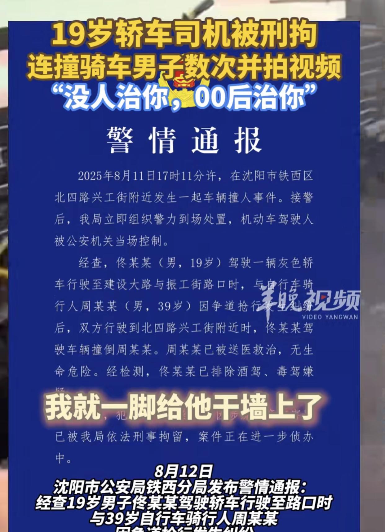 19岁轿车司机狂的没边! 给00后丢脸了。 本来很简单的一件事,现在搞的非常复杂,汽车右转弯遇到了骑共享单车的男子,结果双方都抢道,互不相让,汽车右转时是绿灯,单车过斑马线也是绿灯,这个时候明显是行人优先通行了。 19岁司机还语出惊人“没人治你,00后治你” “我给他干墙上了” 根据现场的网友介绍,当时汽车来回撞了四五次,导致白衣男子受伤。 这也算是典型的“路怒症”了,关键自己一点不占理,也不知道驾照是怎么来的!