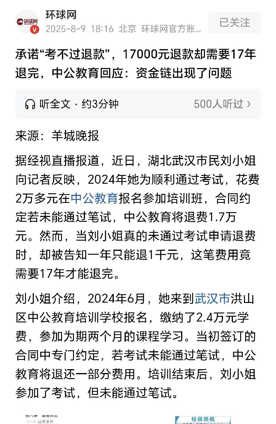 湖北武汉,一女子为通过考试,花24000元报培训班,培训班承诺,如果考不过,退款17000元,可培训完后,女子还是没有通过,找培训班退钱,他们告诉女子,退钱可以,一年只退1次,1次退1000元,退完要17年,女子崩溃,17年后她已经40岁,对方又给她一个方案,女子更加不能接受,培训班建议,你去法院起诉,律师都不用请,100%会赢! 2025年8月9日,据环球报报道,一女子报学习班,退费时遇到难题。 刘女士想找工作,但必须通过考试,可是她心里没底,毕竟已经不是学生。 刘女士心想,与其自己在家里焦虑,不如去找专业人员给予指导,她经过筛选,找到一家教 育 培 训 几 构。 刘女士花了24000元,报名参加了2个月培训班,合同上约定,如果刘女生不能通过笔试,退费17000元。 很快2个月过去,可考试成绩出来,她大失所望,她并没有通过笔试。 刘女士心里难受,决定按照合同约定,找教育 ji 构退费。 她准备好考试未通过证明,6月份的时候,交到了培训 ji 构。 一直等到8月,还是没有动静,刘女士等的急了,到该教育培训学校催促。 培训人员告诉她说,可以退费,但是一年只给退一部分。 刘女士诧异,一部分是多少?工作人员告诉她说,按照规定,17000万元,每年只能退给她1000元。 刘女士惊掉了下巴,这样退费,17年才能退完,这不就是个笑话?17年后,我已经40岁了。 可工作人员没有办法,他只是个职员,只是将规定如实告知。 刘女士找到记者相助,希望该教育ji 构能正视退费问题。 明明合同上约好,乙方如未进入面试, 甲方向乙方退费17000元,为何到了需要兑现承诺时,却提出了这样的退费方式。 刘女士觉得这太搞笑,刚考完试你们都不信守承诺,再等17年,又会有什么说辞? 你们以这种方式退费,为啥不早说,为啥不在合同里注明,有人愿意接受,两厢情愿,那我无话可说。 可是,合同里只说通不过就退费,没有一个字说一年退一千元! 记者和刘女士来到ji 构大厅,前台告诉记者,该教 育 的资金 链出现了问题,所以采取这种退费方式。 工作人员还说,20000以上的培训课程每年退客户1000,2万元以下的培训课程每年退500元,一年只退1次。 并且,他们有一个专门退费的处理点,就在某某武汉某培 训 基地。 记者和刘女士匆匆来到工作人员所说的基地,工作人员的答复,更令刘女士感到难过。 根据规定,2022年~2023年参加培训的学员,如果需要退费,20000元以上,1年退费1次。 20000元以下要办退费的,一年只退500元,一直到退完为止。 他们又说,根据最新规定,2024年以后报名培训的学员,一年给退2次,每次退10%,2次就是20%,像刘女士这种情况符合,5年后就能全部退完。 但是,工作人员不能保证,虽然现在是这么说,到了跟前,能不能把钱拿到手里,他们也不知道,因为教育 ji 构已经没钱了。 工作人员还说,建议她走法律程序诉讼,可以直接在网上申请起诉,然后就等法院的审理。 并且,机构可以向她提供网上起诉系统,不需要律师,能100%胜诉,但是,要等时间。 如果不选这样的起诉,也可以以物 资 来抵扣钱款,可以抵扣60%,剩下的钱会在30天内,全部打给刘女士。 刘女士有些犹豫,到底该如何选择,她还要和家人商量再说。 那么,这件事在法律上是怎么认定的呢? 《民法典》第577条规定:当事人一方不履行合同义务或者履行合同义务不符合约定的,应当承担继续履行、采取补救措施或者赔偿损失等违约责任。 刘女士与教育 ji 构签订的培训合同明确约定,未通过笔试则退费17000元,该条款构成双方真实意思表示,合法有效。 可是,教育ji 构在刘女士未通过考试后,未按约定一次退费,反而提出“17年分期退费”或“物资抵扣”方案,属于单方面变更合同履行方式,构成违约。 刘女士有权要求教育ji 构继续履行合同义务,或通过诉讼主张违约责任。 《消费者权益保护法》第26条规定:经营者不得以格式条款、通知、声明、店堂告示等方式,作出排除或者限制消费者权利、减轻或者免除经营者责任、加重消费者责任等对消费者不公平、不合理的规定。 《民法典》第496条规定:提供格式条款的一方未履行提示或者说明义务,致使对方没有注意或者理解与其有重大利害关系的条款的,对方可以主张该条款不成为合同的内容。 若教育ji 构在合同中未明确约定“分期退费”或“物资抵扣”条款,而在事后单方面提出此类方案,属于利用格式条款排除消费者主要权利。 刘女士签订合同时未被告知此类限制条款,根据规定,该条款应认定为无效。 教育ji 构不得通过单方规定减轻自身责任,消费者有权拒绝不合理退费方案。 对此,你怎么看? 关注@王哥说法 学法律知识。#头号创作者激励计划#