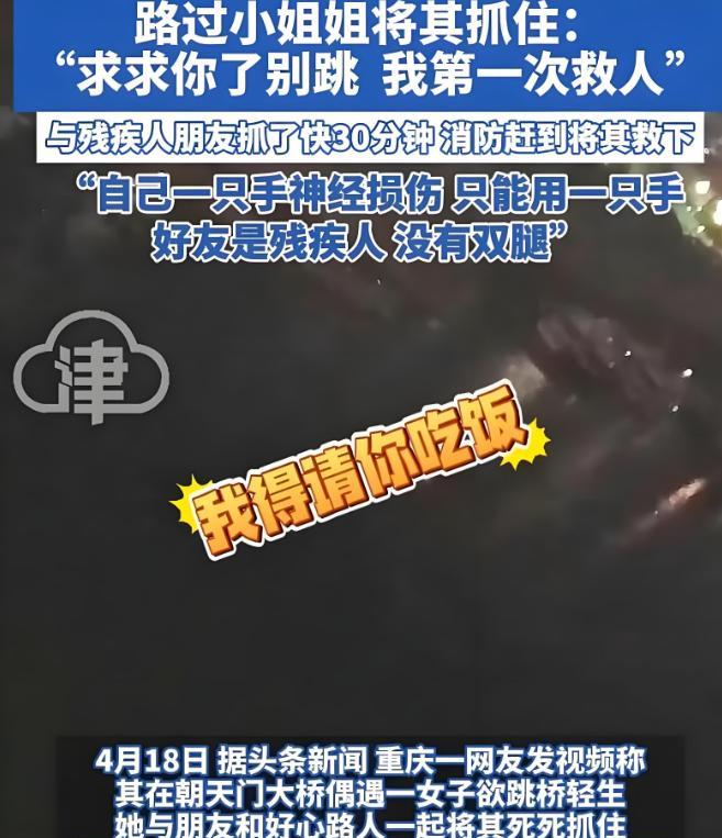 泪目!重庆,一单亲母亲酒后跳桥自杀,路过两个女孩一个只有一只手一个双腿残疾,但还是紧紧拽着轻生女子胳膊不放,女孩一句话令人动容。 事情发生在4月18日深夜,重庆朝天门大桥处,一名女子左右徘徊,看样子喝了不少,犹豫了片刻,女子还是双手撑住了栏杆。 眼看就要跳桥自杀,一名独臂女孩正好路过,飞奔到跟前,用仅剩的一只手紧紧拽住女子的胳膊,紧接着,女孩的朋友一个双腿残疾的女孩也推着轮椅到了跟前,用栏杆将轮椅卡住,然后双手紧紧抱着女子。 两个救人的女孩都是残疾人,不多时就累得满头大汗,可那跳桥的女子还是奋力挣扎,似乎早已对这世间绝望。 独臂女孩忍不住激动说道:“求求你了别跳,我这是第一次救人,我请你吃饭!” 听到这话,女子才逐渐冷静下来,路过的行人帮忙报了警,只是不知道具体情况如何,没有一个人敢过去帮忙。 就这样,两个残疾女孩硬撑了30分钟,直到警方赶来,合力将女子拉到了平地上,此时两个女孩也累得筋疲力尽。 事后警方调查发现跳桥的女子是一位单亲母亲,家庭的重担让她心生绝望,这才趁着酒劲打算一死了之,经过警方的劝说,女子很快恢复了平静。 或许,从两个残疾女孩救她的那一刻起,她就想好了要好好活着,毕竟她们的情况都比自己困难,她还有什么理由不努力生活呢? 两名残疾女孩随后获得了表彰,在接受采访时她们说:活着才是最大的希望!
