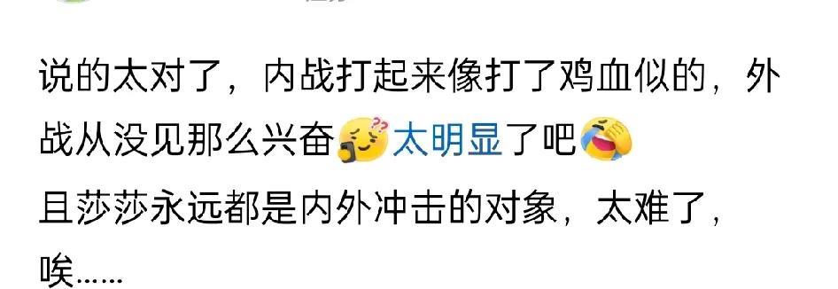 陈幸同打败孙颖莎,网络上开始出现诸如此类的言论,言论一:女队要是没有孙颖莎干掉外协,这次冠军恐怕也拿不到。言论二:内战打起来像打了鸡血一样,外战从来没那么兴奋,莎莎永远都是内外冲击的对象,太难了。言论三:所有国内队员都在以打赢莎莎来证明自己,所以比打外战还要卖力。言论四:莎莎还是退出几次比赛吧,机器也得保养啊!我都不确定这些人是不是孙颖莎的粉丝了。大家都是运动员啊,无论是内战还是外战,运动员比的不就是输赢吗?对手无论是谁都用全力以赴,大家都是竞争关系,谁会给谁放水呢? 往常孙颖莎粉丝夸她都是用这样的词:内心干净、善良、大格局、胸前的国旗永远高于背后的名字、为国家荣誉放弃个人梦想………现在夸出悲情来了,夸成内战外战的靶子了,大家都是一对一啊,只是在不同的赛事上赢了她而已。孙颖莎也没垮,她一直都在战斗,粉丝们实在没必要给她营造这个氛围。