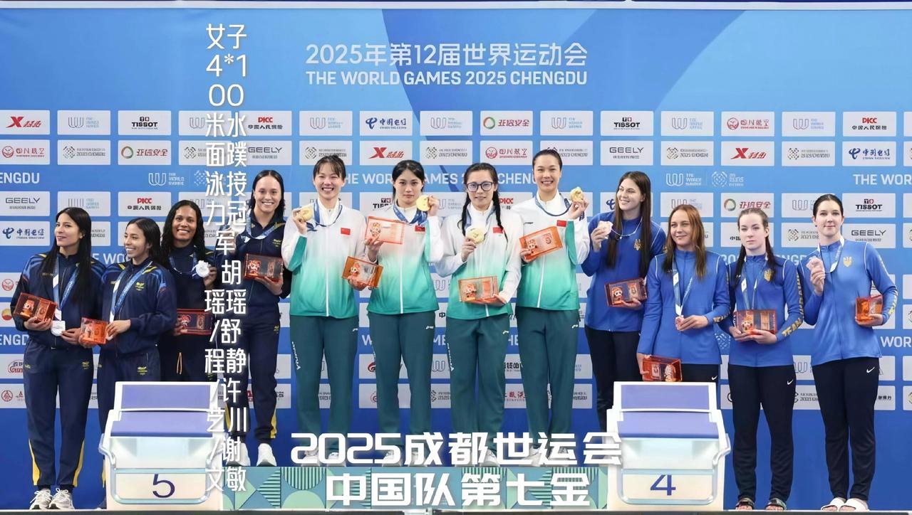【2025成都世运会中国健儿夺冠时刻!中国队第六金到第十金!】 中国队本届世运会第六金来自残疾人自由潜水女子动态有蹼FFS1-FFS2项目,黄诗雨夺冠。 第七金:女子4×100米水面蹼泳接力,冠军:胡瑶瑶/舒程静/许艺川/谢文敏。 第八金:女子尾波滑水自由式,冠军:徐露; 第九金和第十金都来自跆拳项目,跆拳女子48公斤级冠军:刘晓慧;泰拳女子60公斤级冠军:韩鑫。