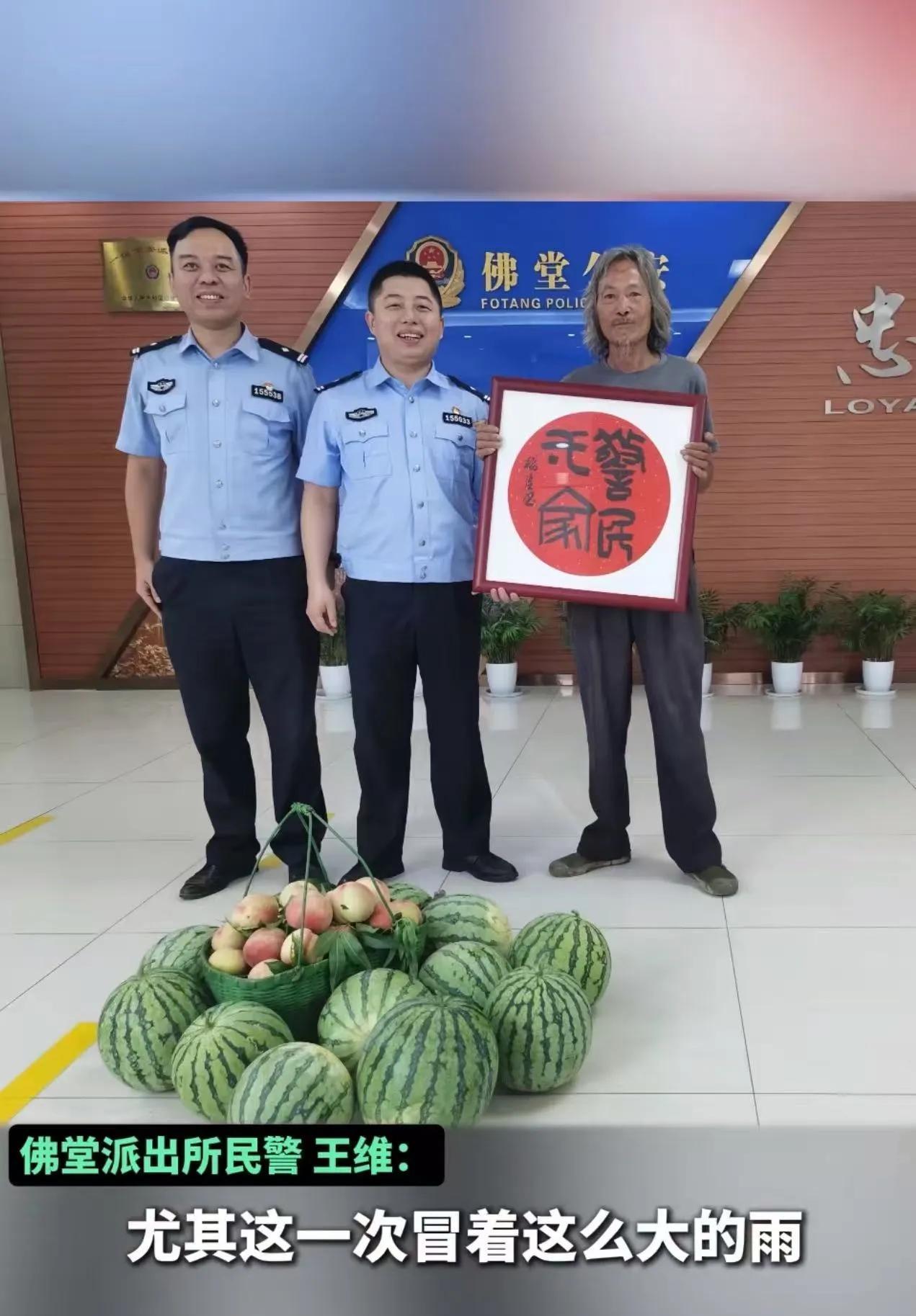 “警民一家亲!”浙江义乌,大爷冒雨骑电瓶车给派出所民警送去两篮自家种的桃子,把民警们感动的都哽咽了!更让人感动的是,这不是老人第一次送桃子,这样的事情他已经连续坚持了11年,原来,这背后还有一个感人的故事! (来源:义乌公安) 2015年,王大爷的果园频频被盗。这个果园,是王大爷维持生计的收入来源,看着那些成熟的果实,一筐筐地被盗走,就像从王大爷的心头生生剜去一块肉,让他心疼的不行! 王大爷愁得吃不下饭、睡不着觉,于是怀着忐忑的心情,向当地派出所报了案,希望能得到帮助。 一开始,王大爷心里直犯嘀咕,他担心民警们每天要处理那么多大事,自己果园被盗这点“小事”,人家会不会根本不放在心上。 可令他万万没想到的是,民警们得知情况后,没有丝毫的懈怠和推诿。他们迅速行动起来,连夜在果园附近蹲守,终于成功将盗贼抓获,为王大爷挽回了损失。 而且盗贼落网以后,民警们并没有就此停下脚步。他们深知果园对于王大爷的重要性,为了防止类似的事情再次发生,还专门安排了警力在果园附近巡逻守护。 王大爷看在眼里,感动在心里。为了表达自己对民警们的感激之情,每年桃子成熟的时候,他都会精心挑选又大又甜的桃子和新鲜的西瓜,送到派出所去。 而这一送,就是整整10多年,风雨无阻,这份感恩的情谊从未间断。 这天,天刚蒙蒙亮,王大爷就早早地起了床。他把最大、最甜、色泽最鲜艳的桃子摘下来,小心翼翼地放进篮筐里。 不一会儿,两个篮筐就装得满满当当,可是就在王大爷刚准备把装满桃子的篮筐送去派出所的时候,原本晴朗的天空突然乌云密布,紧接着,一场倾盆大雨毫无征兆地下了起来。 王大爷看着被雨水打湿的篮筐,心里着急得不行,他担心桃子放久了会坏掉,那自己的一片心意可就大打折扣了。 于是,王大爷顾不上自己被雨水淋湿,迅速穿上雨衣,把两个装满桃子的筐子放在电瓶车上,然后冒着大雨,朝着派出所的方向驶去。 当王大爷浑身湿透地出现在派出所门口时,民警们都被眼前的景象感动了。他们看着那两个装满桃子的篮筐,仿佛看到了王大爷十一年来坚持不懈的感恩之心。 民警说,这些桃子,还没吃,就感觉已经甜到自己的心里! 在王大爷准备离开的时候,民警们特意为他准备了一份防暑大礼包。他们希望通过这份小小的礼物,将这份警民之间的情义传承下去,让温暖在彼此心中永远流淌。 这不仅仅是普通的桃子,更是王大爷对民警们深深的敬意和感激! 王大爷和民警们之间这份长达十一年的情谊,就像一首动人的歌谣,唱响了警民鱼水情的赞歌;又似一幅美丽的画卷,描绘出了人间最真挚、最温暖的情感。 他们用实际行动诠释了什么是相互理解、相互支持,什么是真正的鱼水情深,这份情谊,值得我们每一个人去赞美、去传颂!#头号创作者激励计划#