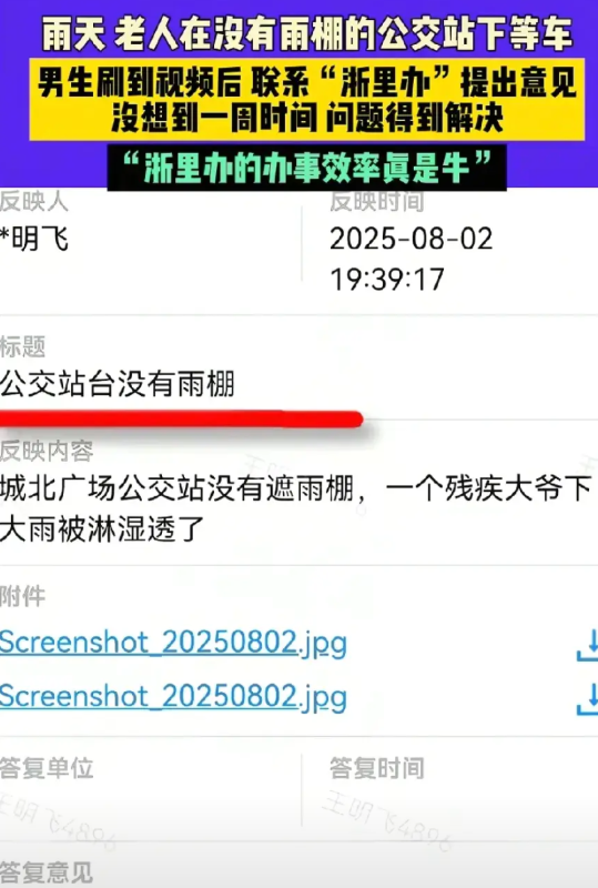 8月11日(发布),浙江一残疾老人,大雨天在没有雨棚的公交站等车,全身淋湿,蜷缩在站牌旁,站都站不稳。男子刷到这个视频后,联系“浙里办”并提出意见,没想到一周时间,安装了雨棚,还设有座椅。网友直呼:“浙里办的办事效率真是牛。”