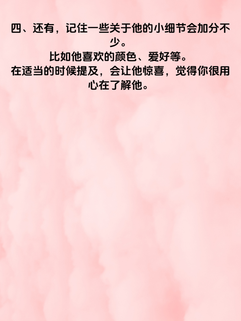 一、在追求男神的旅程中,细节可是关键的制胜法宝。一个不经意的眼神交汇,或许就能在他心中泛起涟漪。比如,当你们聊天时,专注地看着他的眼睛,认真倾听他说的每一句话,让他感受到被重视。 二、恰到好处的微笑也极具魅力。真诚的笑容能瞬间拉近彼此距离,让男神更容易对你产生好感。无论是日常相遇还是特别时刻,都别忘了展现你的灿烂笑容。 三、注意自己的言行举止同样重要。保持优雅大方,走路时挺直腰背,说话轻声细语。这些小细节会让你在男神眼中更具吸引力,展现出独特的气质。 四、还有,记住一些关于他的小细节会加分不少。比如他喜欢的颜色、爱好等。在适当的时候提及,会让他惊喜,觉得你很用心在了解他。 五、制造一些专属的小细节也很棒。比如为他准备一份小点心,附上一张写满心意的纸条。这些独特的举动会让他深深记住你,助力你成功追求到男神。