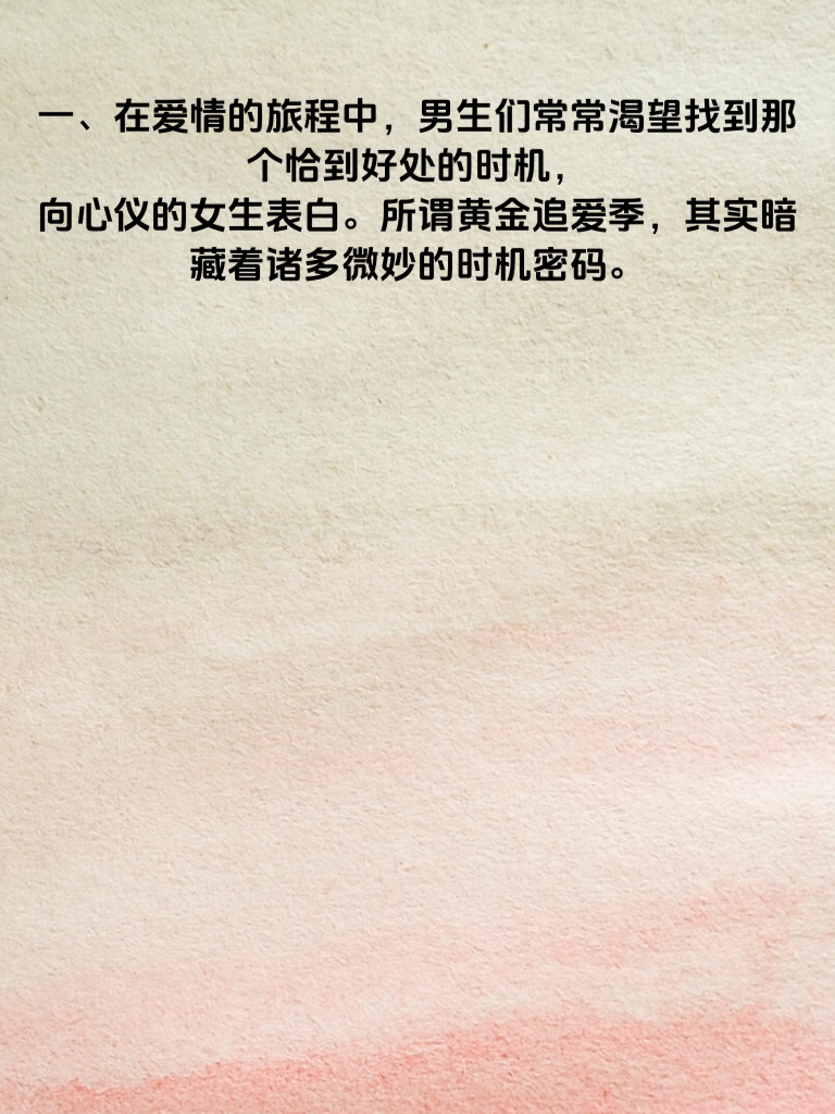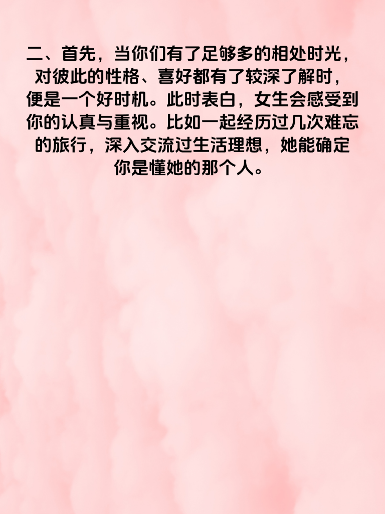 一、在爱情的旅程中,男生们常常渴望找到那个恰到好处的时机,向心仪的女生表白。所谓黄金追爱季,其实暗藏着诸多微妙的时机密码。 二、首先,当你们有了足够多的相处时光,对彼此的性格、喜好都有了较深了解时,便是一个好时机。此时表白,女生会感受到你的认真与重视。比如一起经历过几次难忘的旅行,深入交流过生活理想,她能确定你是懂她的那个人。 三、还有,当她遇到困难,而你及时出现在她身边给予支持和帮助后。她内心会对你产生更深的依赖与信任,表白成功几率大增。比如她工作受挫心情低落,你耐心倾听安慰,陪她一起分析解决问题。 四、再者,两人相处氛围轻松愉悦,有很多共同话题,常常一起欢笑时,也是表白的黄金时刻。在这样美好的氛围下,她更容易接受你的爱意。 五、最后,要避开她情绪不佳、忙碌或者有其他重大事情困扰的时候。选对时机,让表白成为开启幸福爱情的钥匙,而不是给她增添压力。