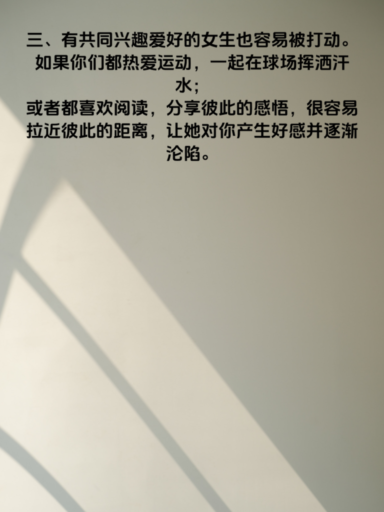 一、男人必看:这几种女生最易沦陷。在追求女生的道路上,了解哪些女生更容易心动是关键。 二、温柔似水的女生往往很容易让人心生怜惜。她们说话轻声细语,总是带着善意的微笑,能给男生带来温暖的感觉。当你对她们展现出关心和体贴时,她们很可能会慢慢沦陷。 三、有共同兴趣爱好的女生也容易被打动。如果你们都热爱运动,一起在球场挥洒汗水;或者都喜欢阅读,分享彼此的感悟,很容易拉近彼此的距离,让她对你产生好感并逐渐沦陷。 四、懂得欣赏你的女生更是如此。她会关注你的优点,认可你的努力,这种欣赏会让你在她眼中闪闪发光。当她看到你为了梦想拼搏,她会不自觉地被你吸引,进而陷入你的情感世界。 五、所以,男人们要用心去发现身边这样的女生,用真诚和爱意去对待她们,让她们在你的温柔攻势下,心甘情愿地沦陷。
