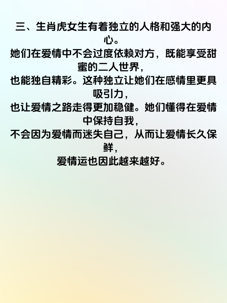 一、生肖虎的女生,天生自带一种独特的魅力,她们热情似火,活力满满,就像春日里盛开的花朵,总能吸引众多目光。在爱情的道路上,生肖虎的桃花往往格外旺盛。她们勇敢追求自己心仪的对象,毫不羞涩,这种积极主动的态度为她们赢得了不少机会。 二、生肖虎女生对待爱情真诚且专一。一旦陷入爱河,她们会全心全意付出,用自己的热情温暖对方。她们的真诚能打动身边的人,让爱情运一路顺遂。她们不会在感情中玩暧昧,明确的态度让对方清楚知道她们的心意,减少了许多不必要的误会。 三、生肖虎女生有着独立的人格和强大的内心。她们在爱情中不会过度依赖对方,既能享受甜蜜的二人世界,也能独自精彩。这种独立让她们在感情里更具吸引力,也让爱情之路走得更加稳健。她们懂得在爱情中保持自我,不会因为爱情而迷失自己,从而让爱情长久保鲜,爱情运也因此越来越好。