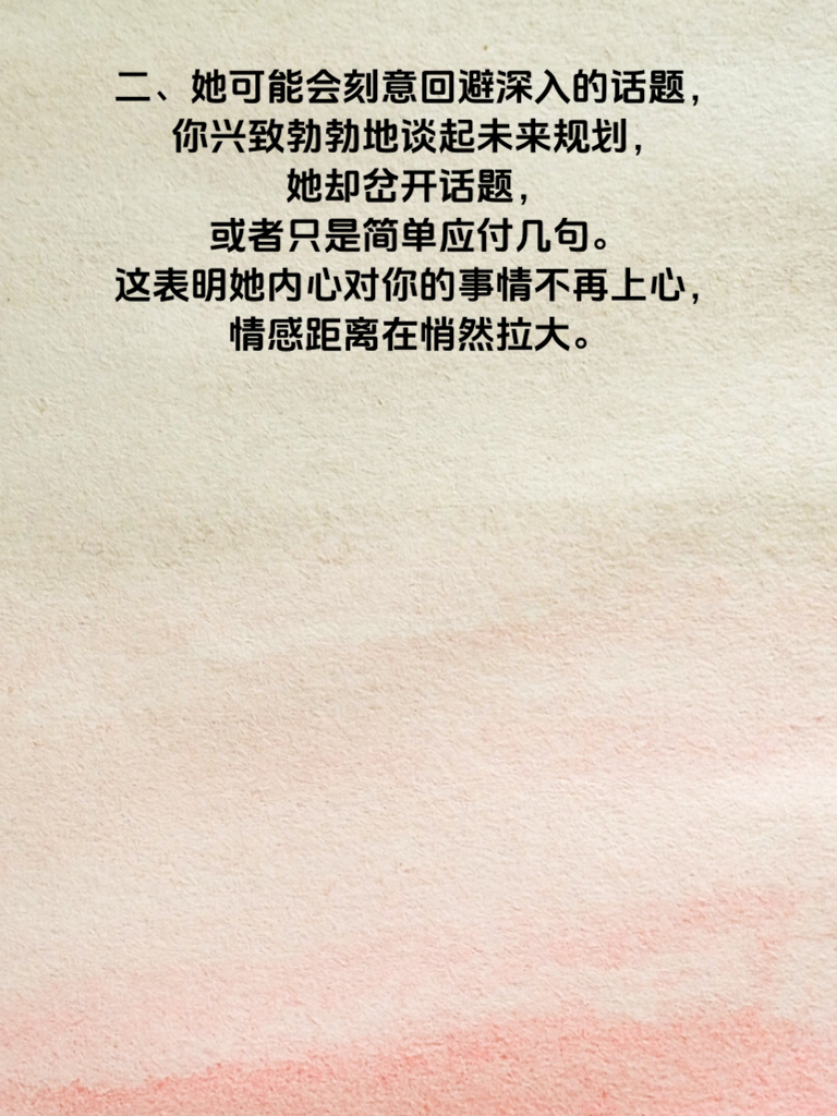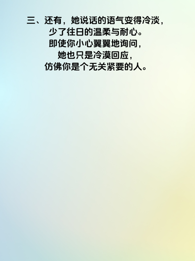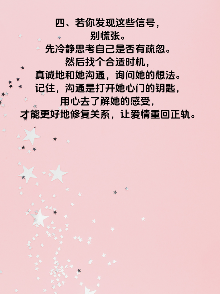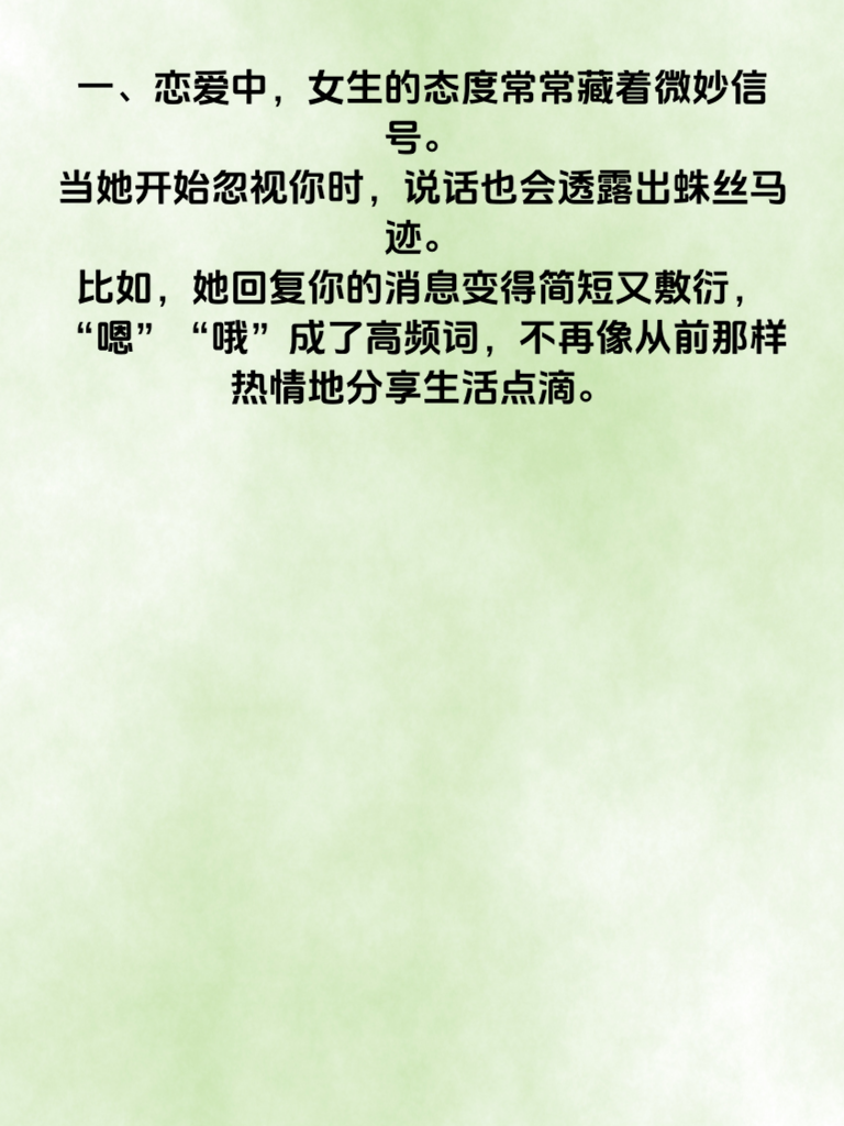 一、恋爱中,女生的态度常常藏着微妙信号。当她开始忽视你时,说话也会透露出蛛丝马迹。比如,她回复你的消息变得简短又敷衍,“嗯”“哦”成了高频词,不再像从前那样热情地分享生活点滴。 二、她可能会刻意回避深入的话题,你兴致勃勃地谈起未来规划,她却岔开话题,或者只是简单应付几句。这表明她内心对你的事情不再上心,情感距离在悄然拉大。 三、还有,她说话的语气变得冷淡,少了往日的温柔与耐心。即使你小心翼翼地询问,她也只是冷漠回应,仿佛你是个无关紧要的人。 四、若你发现这些信号,别慌张。先冷静思考自己是否有疏忽。然后找个合适时机,真诚地和她沟通,询问她的想法。记住,沟通是打开她心门的钥匙,用心去了解她的感受,才能更好地修复关系,让爱情重回正轨。