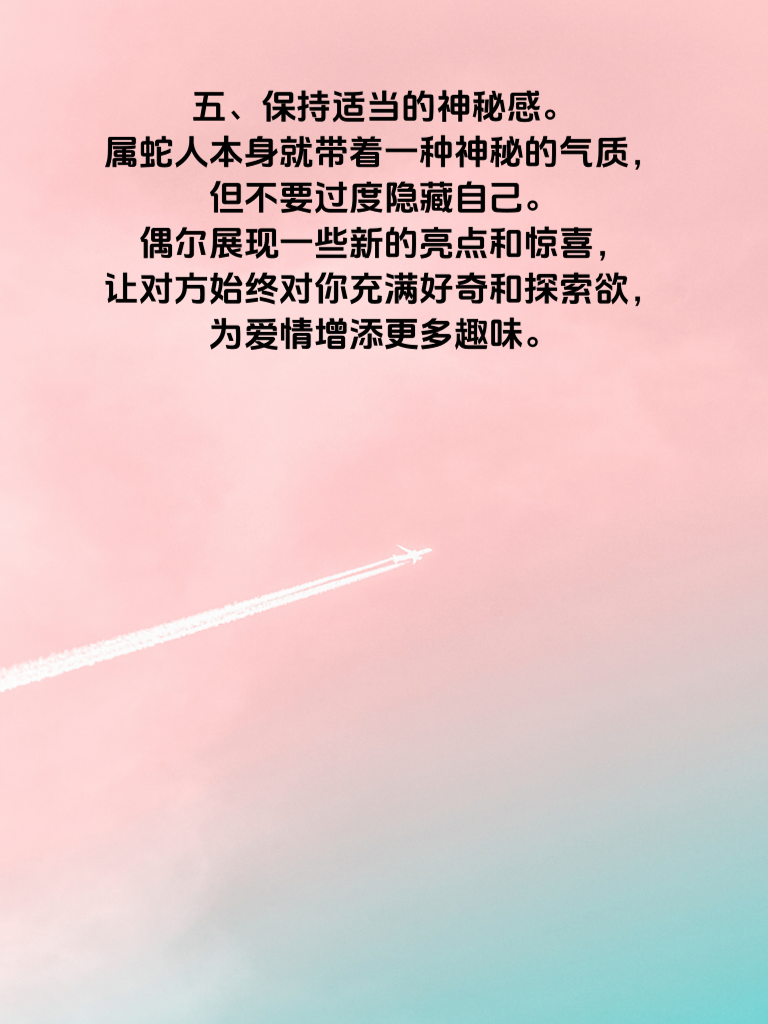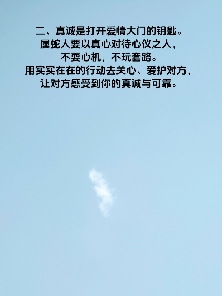 一、属蛇的人在爱情中往往有着独特的魅力。他们聪明伶俐,心思细腻,能敏锐地察觉到对方的情绪变化。想要赢得爱情,首先要保持这份敏锐,在日常相处中,多关注对方的喜好与需求。 二、真诚是打开爱情大门的钥匙。属蛇人要以真心对待心仪之人,不耍心机,不玩套路。用实实在在的行动去关心、爱护对方,让对方感受到你的真诚与可靠。 三、展现自己的才华与智慧。属蛇人通常很有内涵,将自己的优势充分展示出来,无论是在工作上的成就,还是在兴趣爱好方面的特长,都能吸引对方的目光,让对方对你产生钦佩与欣赏。 四、懂得倾听也很重要。在与对方交流时,耐心倾听对方的想法和感受,给予对方充分表达的机会。适时地给予回应和理解,这样能让对方感受到你对她的尊重,拉近彼此的距离。 五、保持适当的神秘感。属蛇人本身就带着一种神秘的气质,但不要过度隐藏自己。偶尔展现一些新的亮点和惊喜,让对方始终对你充满好奇和探索欲,为爱情增添更多趣味。