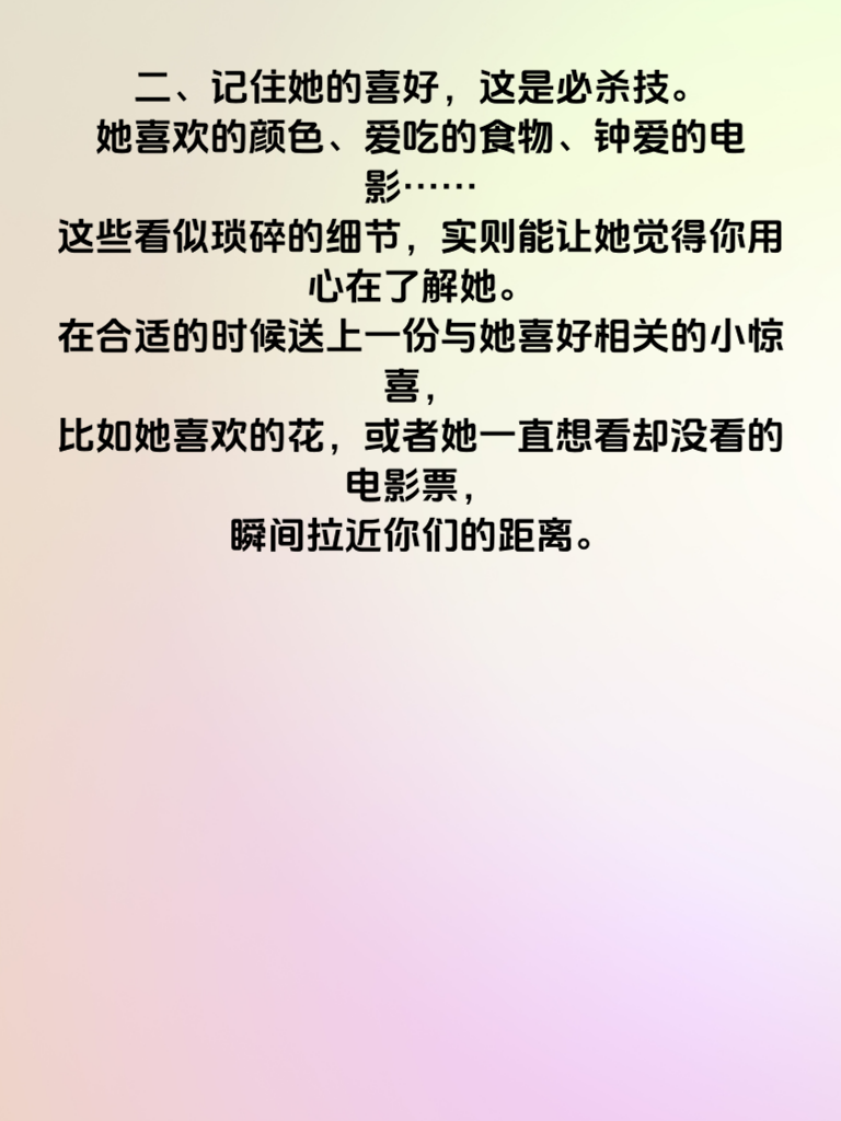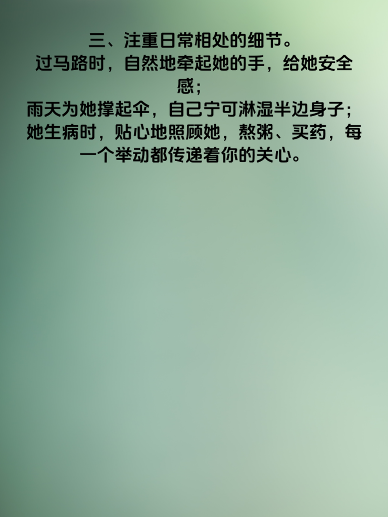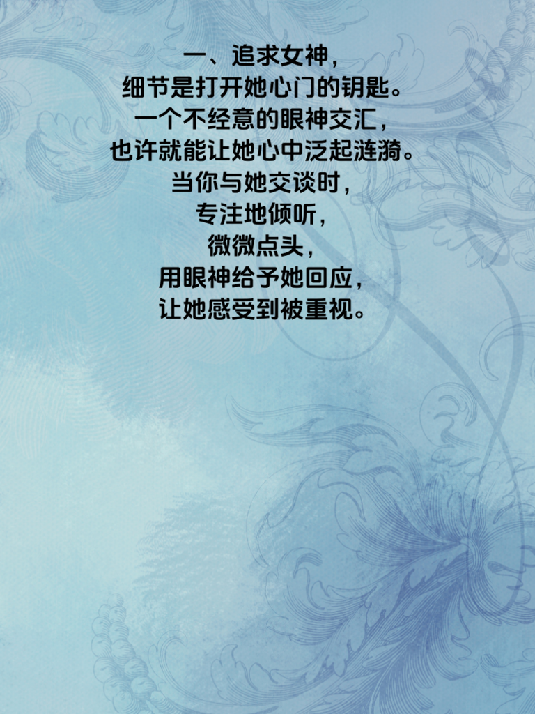 一、追求女神,细节是打开她心门的钥匙。一个不经意的眼神交汇,也许就能让她心中泛起涟漪。当你与她交谈时,专注地倾听,微微点头,用眼神给予她回应,让她感受到被重视。 二、记住她的喜好,这是必杀技。她喜欢的颜色、爱吃的食物、钟爱的电影……这些看似琐碎的细节,实则能让她觉得你用心在了解她。在合适的时候送上一份与她喜好相关的小惊喜,比如她喜欢的花,或者她一直想看却没看的电影票,瞬间拉近你们的距离。 三、注重日常相处的细节。过马路时,自然地牵起她的手,给她安全感;雨天为她撑起伞,自己宁可淋湿半边身子;她生病时,贴心地照顾她,熬粥、买药,每一个举动都传递着你的关心。 四、细节还体现在你的言行一致上。答应她的事一定要做到,不要轻易许下空头承诺。用实际行动证明你是个靠谱且值得信赖的人,如此,她对你的好感度定会不断攀升。