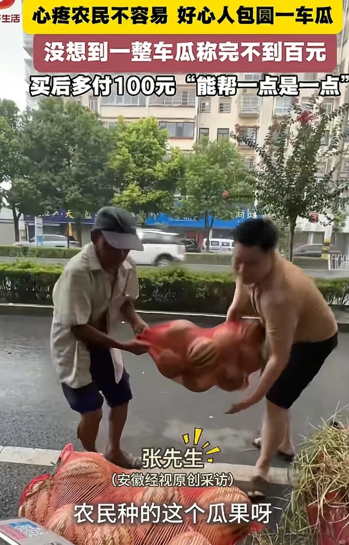 男子瞬间惊呆了,他没想到这一整车瓜竟然不足百元,本来是想着帮老夫妻一把,现在反而觉得自己占了便宜。他于心不忍,又掏出钱包说:“再给100!‘’