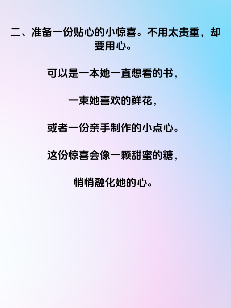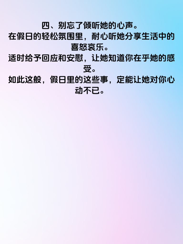一、假日,是追求女生的绝佳时机。想让她心动,不妨试试这些事。首先,精心策划一次独特的约会。避开喧嚣的商场和拥挤的餐厅,选择一处宁静又美丽的地方,比如有花海的公园或者能俯瞰城市夜景的天台。 二、准备一份贴心的小惊喜。不用太贵重,却要用心。可以是一本她一直想看的书,一束她喜欢的鲜花,或者一份亲手制作的小点心。这份惊喜会像一颗甜蜜的糖,悄悄融化她的心。 三、安排一些有趣的互动。一起去做陶艺,感受泥土在手中成型的乐趣;或者来一场户外骑行,欣赏沿途的风景。在互动中,增进彼此的了解,让她发现你的有趣和活力。 四、别忘了倾听她的心声。在假日的轻松氛围里,耐心听她分享生活中的喜怒哀乐。适时给予回应和安慰,让她知道你在乎她的感受。如此这般,假日里的这些事,定能让她对你心动不已。