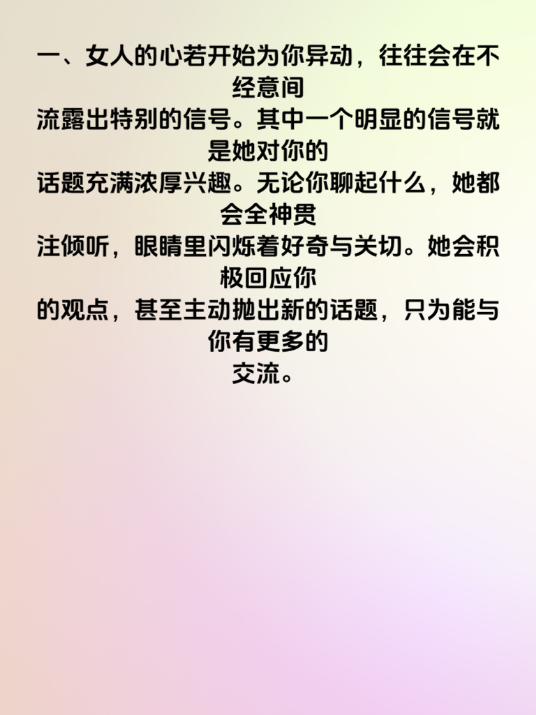一、女人的心若开始为你异动,往往会在不经意间流露出特别的信号。其中一个明显的信号就是她对你的话题充满浓厚兴趣。无论你聊起什么,她都会全神贯注倾听,眼睛里闪烁着好奇与关切。她会积极回应你的观点,甚至主动抛出新的话题,只为能与你有更多的交流。 二、还有,她开始注重自己在你面前的形象。会刻意打扮自己,每次与你见面都精心挑选衣服,妆容精致。这是因为她渴望在你眼中留下美好的印象,希望你能看到她最美的一面,也侧面反映出她对你的在意程度在加深。 三、再者,她会主动关心你的生活点滴。会询问你今天过得怎么样,有没有遇到什么开心或不开心的事。当你生病或情绪低落时,她会第一时间送上温暖的问候和关心,甚至可能会贴心地为你准备一些小惊喜来安慰你。这些都是她心系你的有力暗示。