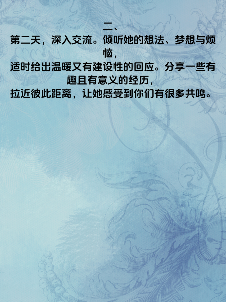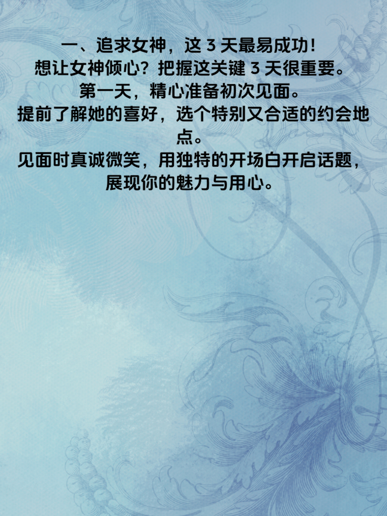 一、追求女神,这 3 天最易成功!想让女神倾心?把握这关键 3 天很重要。第一天,精心准备初次见面。提前了解她的喜好,选个特别又合适的约会地点。见面时真诚微笑,用独特的开场白开启话题,展现你的魅力与用心。 二、第二天,深入交流。倾听她的想法、梦想与烦恼,适时给出温暖又有建设性的回应。分享一些有趣且有意义的经历,拉近彼此距离,让她感受到你们有很多共鸣。 三、第三天,制造难忘瞬间。一起去做她喜欢的事,比如看一场浪漫的电影,或者去她心仪的餐厅用餐。在细节处关怀她,比如为她披件外套,递上一杯热饮。在这一天,勇敢表达你的心意,让她知道你对她的感情已不一般。把握好这 3 天,成功追求女神不再是梦!