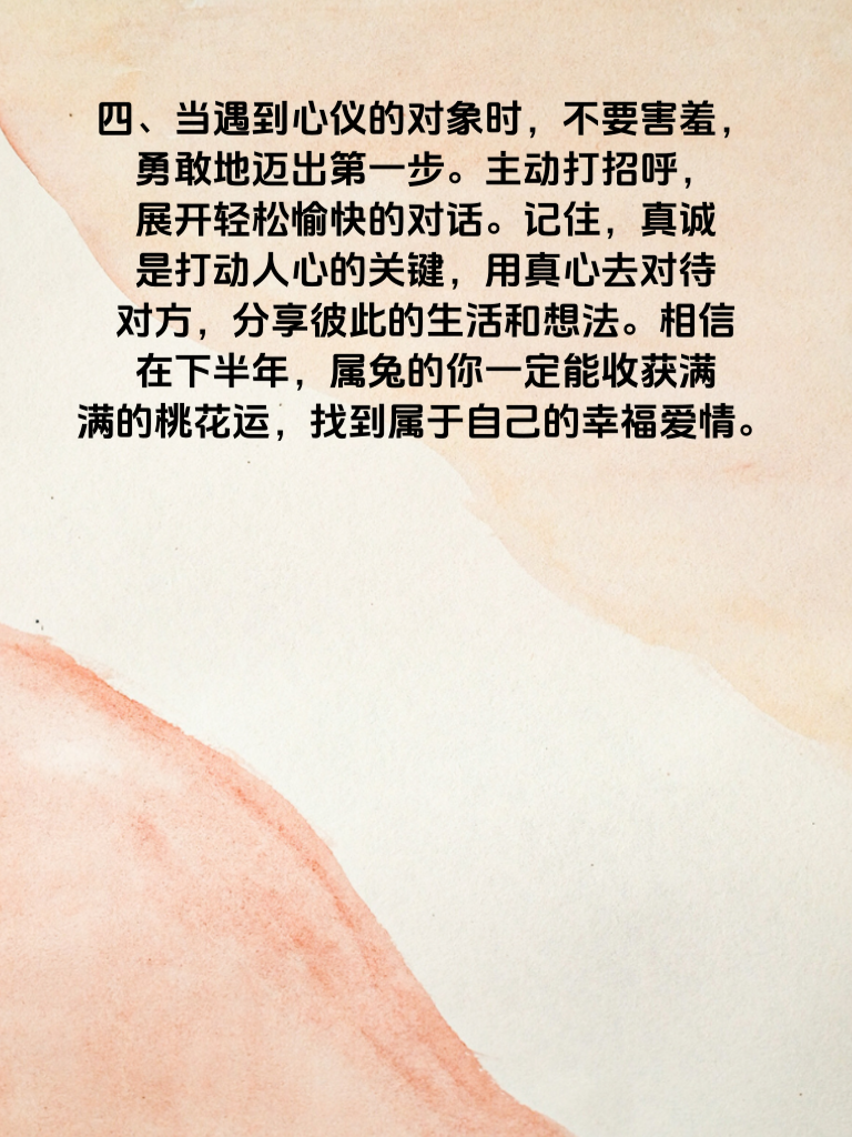 一、属兔的朋友们,下半年可是你们桃花运爆棚的好时机哦!想要在这段时间邂逅爱情,那就得好好准备啦。首先,要保持积极乐观的心态,微笑是最具感染力的,它能让你在人群中瞬间脱颖而出,吸引到那个特别的人。 二、多参加一些社交活动,扩大自己的社交圈。无论是朋友聚会、兴趣小组还是志愿者活动,都是结识新人的好机会。在活动中,展现出自己真诚友善的一面,主动与他人交流互动。 三、注重自身形象的塑造。根据不同场合选择合适的服装搭配,展现出自己独特的风格。保持良好的仪态,挺胸抬头,自信满满。同时,提升自己的内在修养,多读书、学习新技能,让自己变得更加有内涵。 四、当遇到心仪的对象时,不要害羞,勇敢地迈出第一步。主动打招呼,展开轻松愉快的对话。记住,真诚是打动人心的关键,用真心去对待对方,分享彼此的生活和想法。相信在下半年,属兔的你一定能收获满满的桃花运,找到属于自己的幸福爱情。