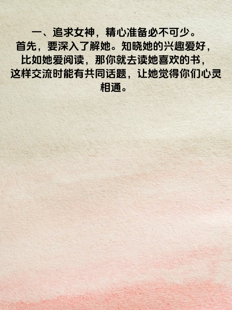 一、追求女神,精心准备必不可少。首先,要深入了解她。知晓她的兴趣爱好,比如她爱阅读,那你就去读她喜欢的书,这样交流时能有共同话题,让她觉得你们心灵相通。 二、提升自身形象也很关键。保持良好的个人卫生,穿着得体且符合自身风格。整洁利落的外表会给她留下好的第一印象,让她愿意进一步了解你。 三、培养自信的气质。相信自己的优点,在她面前展现出积极向上的态度。自信的男人最有魅力,能吸引她不自觉地靠近。 四、准备好真诚的心意。用行动去关心她,在她需要时及时出现。比如她生病时贴心照顾,她难过时耐心倾听。真诚能打动她的芳心,让她感受到你的爱意与温暖,从而对你心生爱慕。