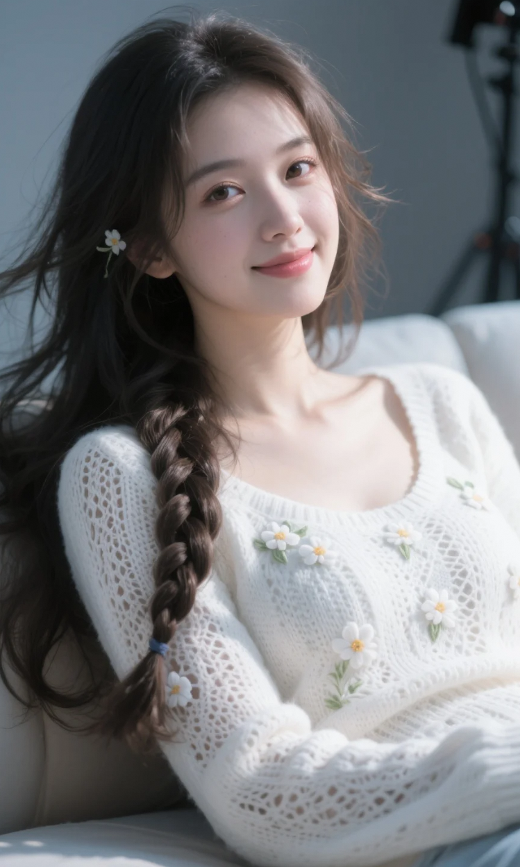 这身白色镂空针织衫+麻花辫造型,直接封神了!