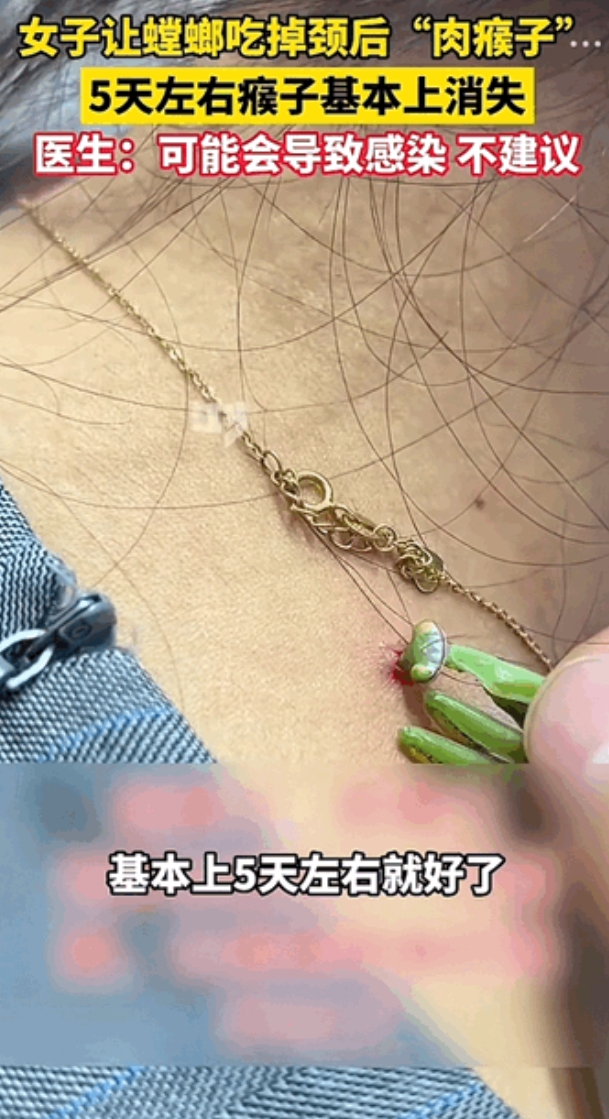 这绝对是狠人!山西,女子相信偏方让螳螂吃掉自己颈部长得肉瘊子,只是感觉螳螂啃的时候有点疼,像针扎一样。当事人说她同事的肉瘊子去年已经被螳螂吃掉了,并且后期恢复的可好了,也没有留疤。这应该没有什么科学依据吧,要是我绝对不敢这样做!网友:这难道就是传说中的“螂中”!