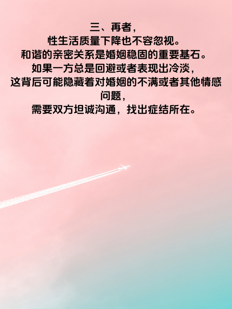 一、婚后的情感生活犹如一场漫长的旅程,途中会有各种风景,也可能暗藏危机。忽视一些关键信号,可能会让原本美好的婚姻逐渐偏离幸福的轨道。 二、首先,沟通频率的明显降低是一个危险信号。曾经无话不谈,如今却相对无言,这往往意味着彼此内心的距离在拉大。每天哪怕抽出十几分钟,认真交流一下工作、生活中的琐事,都能增进了解,避免隔阂加深。 三、再者,性生活质量下降也不容忽视。和谐的亲密关系是婚姻稳固的重要基石。如果一方总是回避或者表现出冷淡,这背后可能隐藏着对婚姻的不满或者其他情感问题,需要双方坦诚沟通,找出症结所在。 四、另外,对彼此兴趣爱好的全然不顾也是警钟。曾经会支持对方的梦想,现在却漠不关心。尝试重新找回对对方爱好的关注,一起参与一些活动,能让感情再度升温。 五、婚后要时刻留意这些信号,及时调整和沟通,用心经营,才能让婚姻长久地保持甜蜜与温馨。