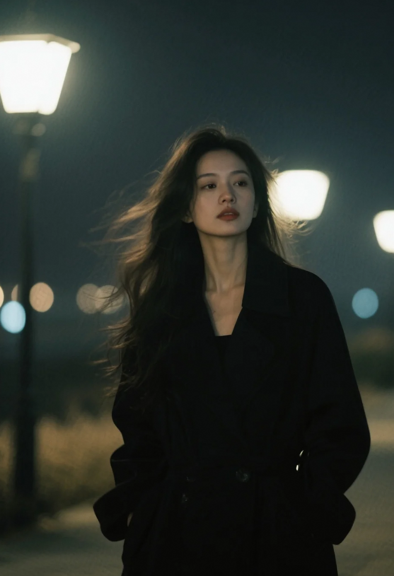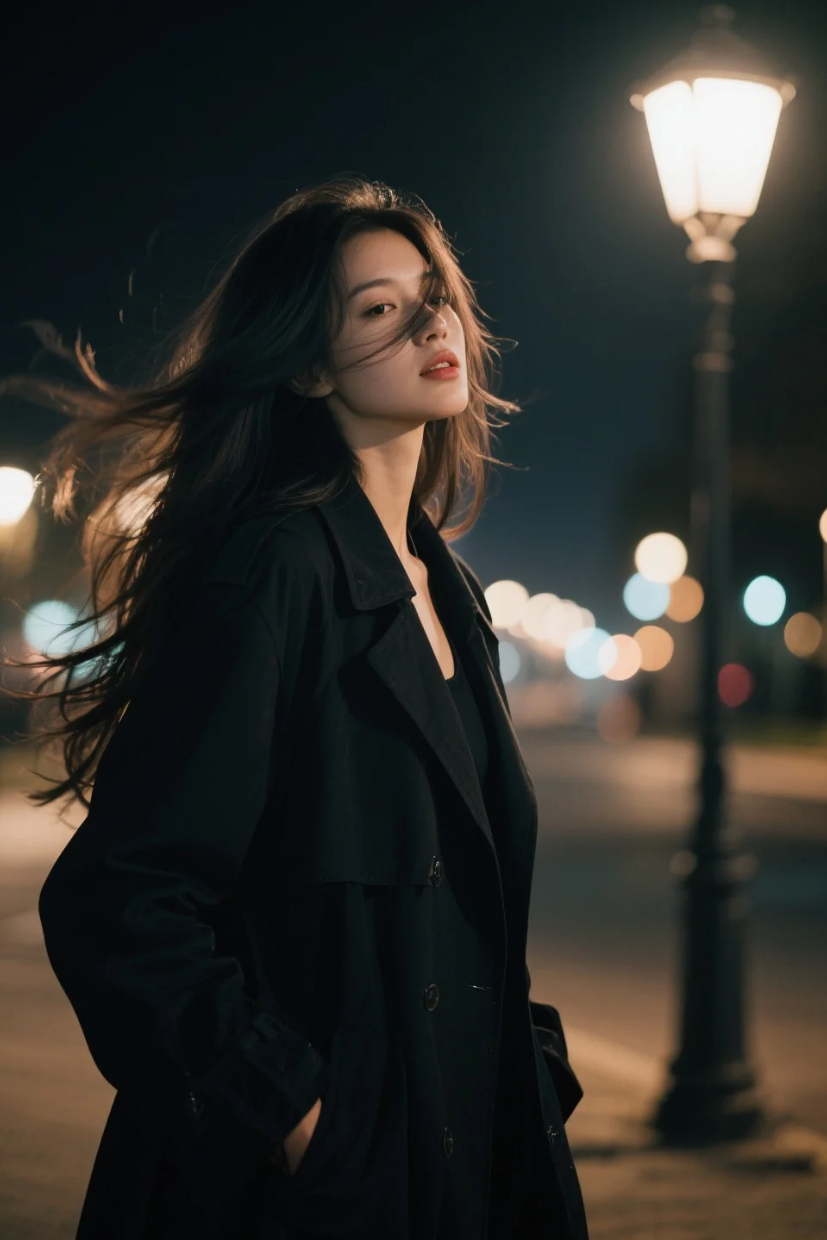 黑色大衣+路灯+长发=都市夜晚的顶级氛围感公式