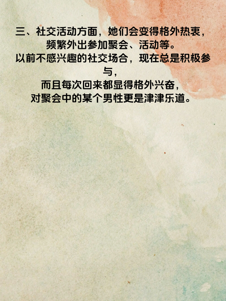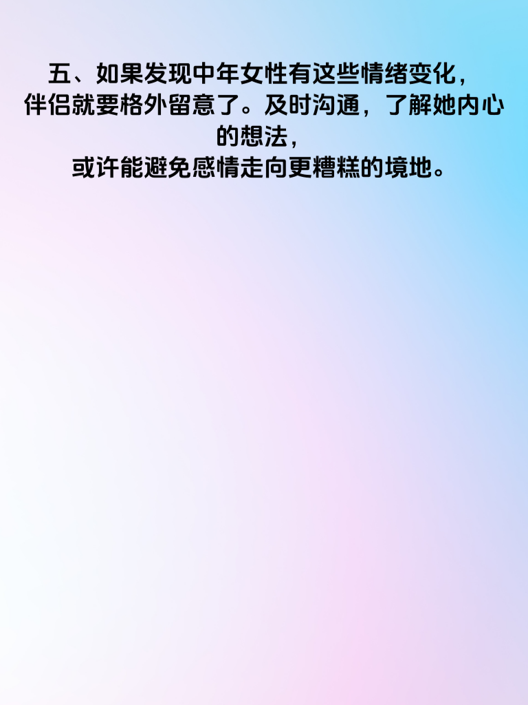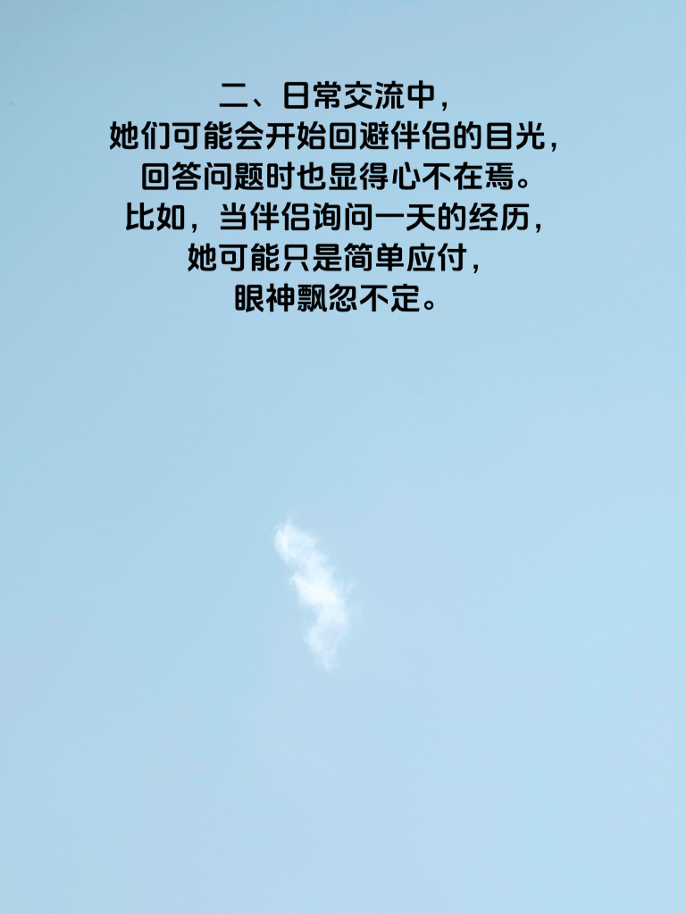 一、中年女性在出轨前,情绪往往会出现微妙变化。她们可能会突然变得比往常更加喜怒无常,时而莫名烦躁,对身边的琐事都容易发火;时而又异常温柔,沉浸在自己的思绪中。 二、日常交流中,她们可能会开始回避伴侣的目光,回答问题时也显得心不在焉。比如,当伴侣询问一天的经历,她可能只是简单应付,眼神飘忽不定。 三、社交活动方面,她们会变得格外热衷,频繁外出参加聚会、活动等。以前不感兴趣的社交场合,现在总是积极参与,而且每次回来都显得格外兴奋,对聚会中的某个男性更是津津乐道。 四、情绪上还会表现出对现有感情的不满增加。常常抱怨伴侣不够关心自己,觉得生活平淡无趣,开始怀念过去恋爱时的激情,这些都是出轨情绪的潜在信号。 五、如果发现中年女性有这些情绪变化,伴侣就要格外留意了。及时沟通,了解她内心的想法,或许能避免感情走向更糟糕的境地。