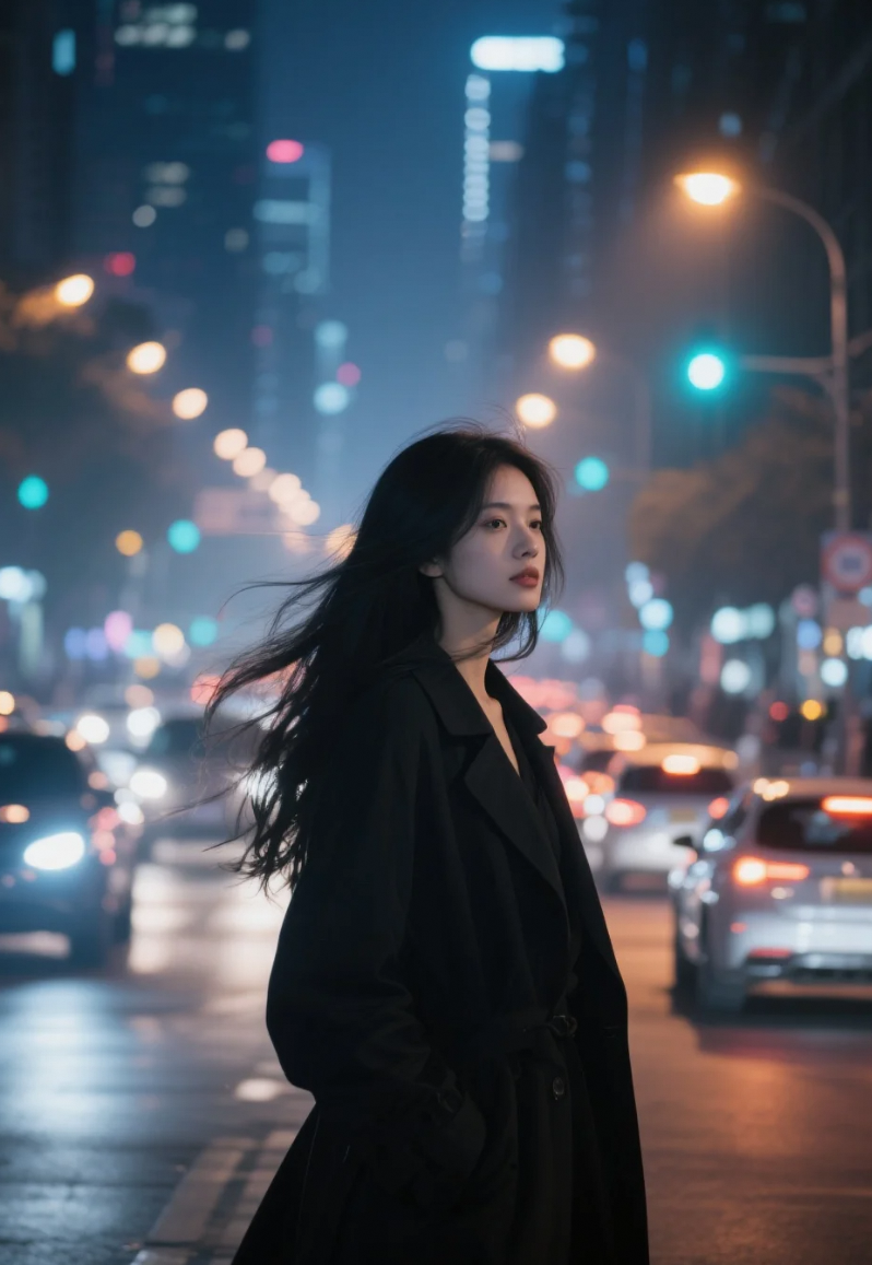 她穿过霓虹与车流,像一座移动的深夜电影画面