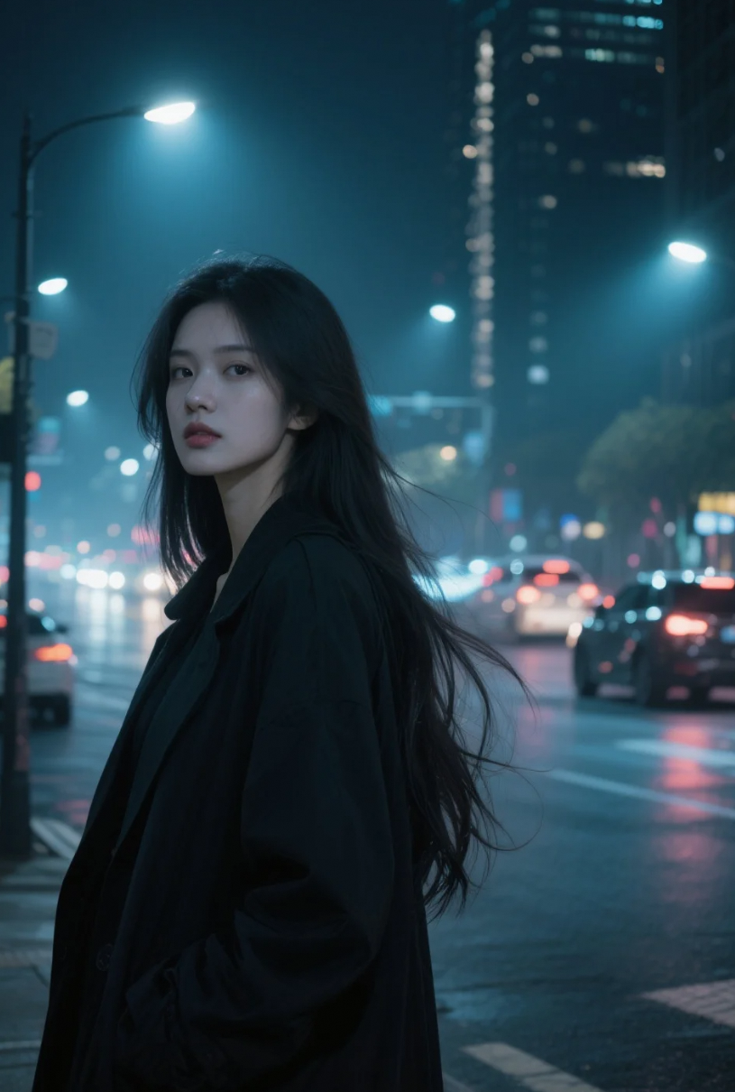 她穿过霓虹与车流,像一座移动的深夜电影画面