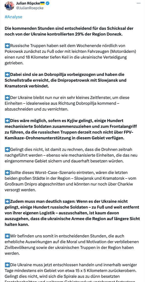 【打了两年多的红军村防线被完全撕开?基辅已经乱成一锅粥,俄方却有点懵】 这两天俄军突然在红军村以北获得了极为意外的突破,基本撕开了乌军重兵集结经营多年的防线,似乎宣告着已经持续两年多年的红军村攻防战出现了戏剧性转折。 根据乌克兰方面的信源,乌军在红军村北侧的突击出奇的顺利,甚至突击距离已经达到了18公里,完全深入乌军在红军村的防御体系,整个已经防线岌岌可危,随时可能崩盘。 截至8月13日,俄军持续调动兵力从北线撕开的口子中疯狂突击,稳固控制区的同时,试图以最快的速度包抄红军村—米尔诺格勒双子城。 乌军被迫调动最能打的“亚速营”部队-第12“亚速”特战旅,在新顿巴斯-斯捷潘-鲁比日内一线紧急布防,试图阻止俄军在多布罗皮利亚以东的进攻势头。 从地图上看,俄军摆出了一个巨大的钳形攻势,红军村—米尔诺格勒双子城近乎已经被三面包围,一旦俄军完成合围,乌军在顿涅茨克州西北部地区的最后筑垒区域就将彻底失守。顿巴斯的最后两个主要城市——斯拉维扬斯克和克拉马托尔斯克将被切断与第聂伯河的联系,后续只能通过哈尔科夫进行补给,而这显然撑不了太久。 俄军的突破来得非常突然,基辅方面陷入了极大的恐慌和困惑,前线到底什么情况?乌军在顿涅茨克西北地区的北翼防线为何会突然之间崩溃? 鉴于乌克兰信源在报道俄军进展时往往会收着说,实际情况可能更糟糕,说不定未来一两天之内,顿涅茨克州西北部地区的战斗就将出现结果。 在普京和特朗普即将在15日进行会面并谈判俄乌停火的当下,俄军在任何一处防线上的重大突破,都将对谈判产生影响,而且是向着有利于俄方的方向发展,这显然是乌克兰绝对不能接受的结果。 就看接下来乌军会以怎样的形势垂死挣扎了。