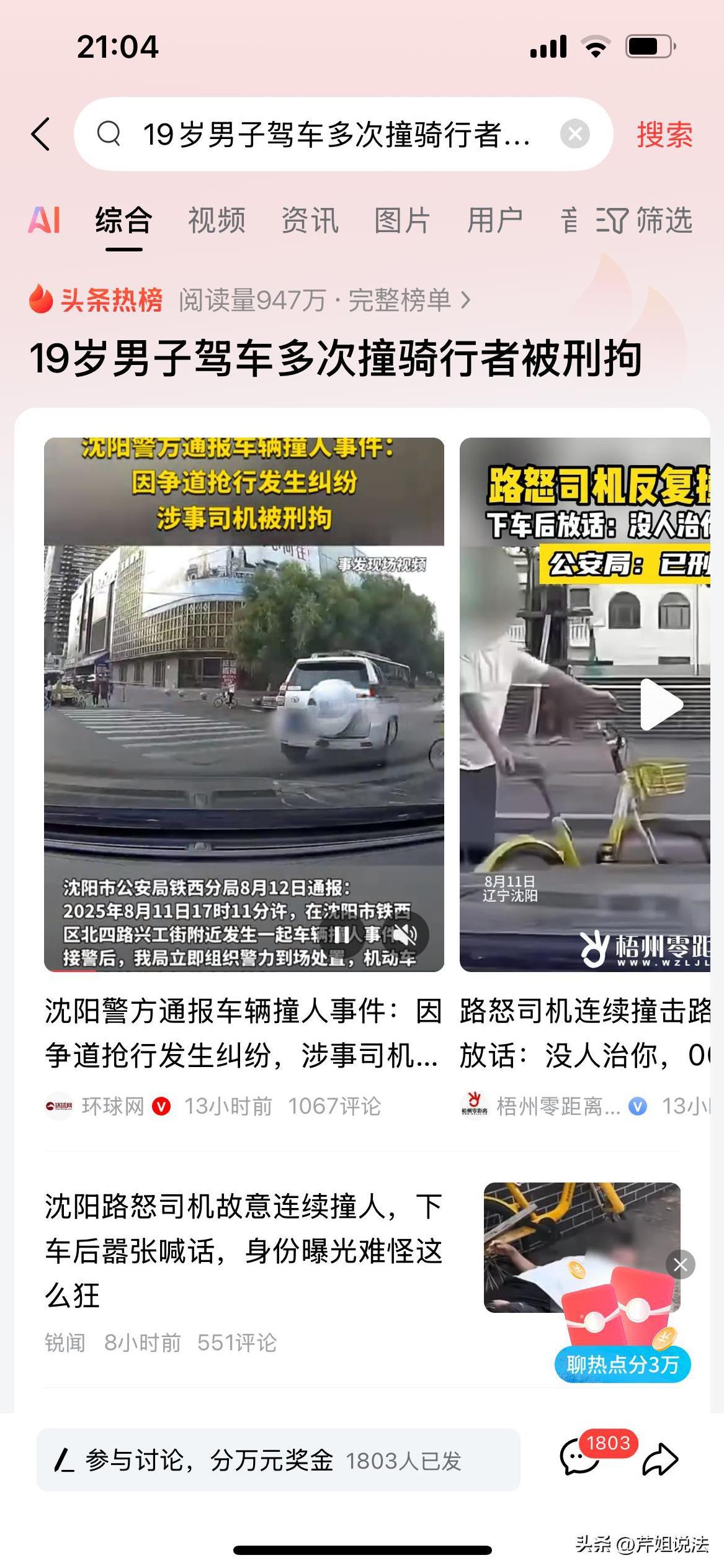 00后整治80后?辽宁沈阳,19岁网红连续多次撞击骑车路人,还叫嚣没有人治你,00后治你!让周围路人纷纷震惊,到底是怎样的深仇大恨?民警表示,已刑拘! 都说00后整顿职场,没想到如今走在路上也能被00后整治。据法治进行时8月12日报道,来自辽宁沈阳的周大哥就遇到了这样一桩飞来横祸。 这天,周大哥骑着共享单车经过某十字路口,人行道显示绿灯,于是本就该正常直行的周大哥并未减速,谁知突然从自己左侧驶来一辆机动车,好在车主发现及时,提前踩了刹车,并未发生事故。 惊魂未定的周大哥下意识瞥了司机一眼,谁曾想这一眼竟然被年轻气盛的车主解读成挑衅,摇下车窗便对着周大哥破口大骂,还指责周大哥闯了红灯。 原来,机动车车主佟某左转时,机动车信号灯显示为绿灯,于是他便下意识认为人行道是红灯,还觉得自己左转主动避让了直行是素质高,骑自行车的周大哥是素质低下。 谁曾想自己刚下自行车,还没来得及站稳,面前的私家车就直直朝自己撞来,周大哥整个人被顶在车头上,巨大的冲击力将他推向身后的柱子,周大哥一瞬间动弹不得。 这样的撞击持续了数次,直到周大哥瘫倒在地,佟某才停止。 佟某还振振有词地说道,是他先闯红灯,我都给他让了,他还来拍我车门!我今天就杀他了! 随后,他还下车指着倒在地上的周大哥说道,没人治你,今天00后治你! 民警随后赶到,本以为两人是有什么深仇大恨,谁知只是素不相识的陌生人,就因为抢道斗气,才导致了这场闹剧。 该视频在网络上掀起轩然大波,到底是什么样的背景让佟某如此肆意妄为? 原来,佟某是网络上小有名气的摄影博主,网络上的成功使得他在现实生活中更加目中无人,以为00后的自己成了正义的化身。 目前,周大哥已被送医,而口出狂言的佟某,等待他的将会是法律的制裁。 佟某可能涉及以下几项罪名: 2.《刑法》第114条/第115条:以危险方法危害公共安全罪 若撞击行为危及不特定多数人安全,如案发现场为十字路口,可能构成本罪,最高可判死刑。 佟某在公共道路上故意撞击行人,可能威胁周边路人安全,但实践中需结合具体危害范围判定。 3.《刑法》第293条:寻衅滋事罪 随意殴打他人、追逐拦截等破坏社会秩序的行为,最高可判十年有期徒刑。 佟某因琐事公然施暴,符合“随意殴打他人+破坏公共秩序”特征。 4.《道路交通安全法》第99条 故意造成交通事故的,可处2000元以下罚款、15日以下拘留,并吊销驾照。 年轻的确是资本,但任何以年龄、群体为借口的违法行为,都将受到法律严惩。 对于这件事,大家怎么看?