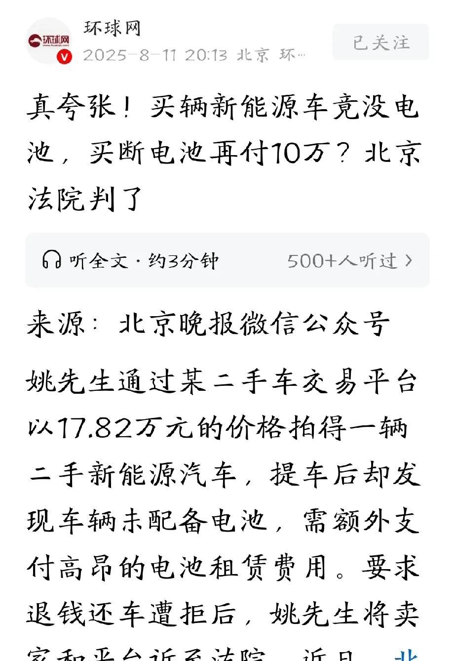 太离谱!北京,男子通过二手车交易平台以17.82万元竞拍到一辆新能源车,本以为捡到了大便宜。可谁知,收到车辆后,男子发现竟然没有电池,每个月还需要额外支付1560元的电池租赁费,购买电池还需要另付10万元。新能源车没有电池,这么重要的信息平台竟然没有任何提示,男子要求退车,却遭到拒绝。男子告上法庭后,法院这样判! 8月11日,据环球网报道,姚先生在二手车平台花17.82万元购买的新能源车,竟然没有用电池,用车还要花高价单独租赁电池。 男子姚先生想入手一辆新能源车,经过多个平台比对,姚先生最终看中了某二手车交易平台的一辆车。 这天,姚先生发现某二手车交易平台有个竞拍活动,竞拍的新能源车正好是他想要的款式。 点开车辆参数信息一看,姚先生对这辆车更加满意了,当即就参与竞拍,最终以17.82万元的价格购得了这辆车。 随后,姚先生就通过平台签订合同,还支付了1.2万多元的服务费,以为自己捡到了大便宜,坐等车辆配送到手。 可谁知,收到车辆后,姚先生傻眼了。 谁能想到,买车竟然没有配置电池,好比买个油车没有发动机一样,没有电池可怎么开呢? 原来,这辆车属于租赁电池版本,每个月需要额外支付1560元的租赁费才能继续使用。 长期租赁电池也不是办法,姚先生打算买个电池,一问价格,他更加不淡定了。 买断电池需要另付10万元,要是这么算下来,这辆车等于花费了将近30万元,这哪里是什么大便宜,这车买的太贵了。 姚先生觉得,这么重要的信息,平台竟然完全没有告知他,这才让他产生误解,花高价购买了这辆车。 姚先生要求平台给他退车并撤销合同。 平台却不乐意,他们认为车辆销售过程中,都没有单独标明电池状态的非行业惯例,这都是姚先生自己没有尽到注意义务,车辆买贵了只能自担责任。 至于卖家王女士,她也不愿意退车。她当初明确给二手车交易平台告知过车辆租赁电池的情况,她如实告知了这一切。 法院经过审理还查明,王女士确实给平台如实说明了车辆电池是租赁的状态,车辆的检测报告上也勾选了“电池租赁”,但交易平台的检测报告却没有呈现这一信息。 对于这一切,法院到底会如何审理呢? 首先,从法律角度来看,电池信息未披露构成“重大误解”。 《民法典》第147条规定:基于重大误解实施的民事法律行为,行为人有权请求人民法院或者仲裁机构予以撤销。 姚先生竞拍的车辆价格为17.82万元,但未包含电池的车辆价值远低于该价格。 根据交易平台惯例,未标注“电池租赁”时默认车辆含电池。 姚先生误以为车辆包含电池而出价,属于对合同标的物性质、价值的重大误解。 电池是新能源车的核心部件,占整车成本的30%-50%,直接影响车辆性能和使用成本。 平台未披露电池需额外付费租赁或买断,导致姚先生对交易标的产生重大认知偏差。 卖家王女士已向平台披露电池租赁信息,履行了卖方义务,故无过错;但平台未在检测报告、合同或页面展示该信息,直接导致买家误解,应承担合同撤销的后果。 其次,二手车交易平台未尽居间人义务,需要承担相应的赔偿责任。 《民法典》第962条规定:居间人应当就有关订立合同的事项向委托人如实报告。 居间人故意隐瞒与订立合同有关的重要事实或者提供虚假情况,损害委托人利益的,不得要求支付报酬并应当承担赔偿责任。 平台作为居间人,需如实审核并披露车辆关键信息。 本案中,平台评估师已勾选“电池租赁”检测项,但未在交易页面公示该信息,属于重大失职。平台声称“未标注电池状态是行业惯例”的辩解不成立。 法院指出,二手车交易平台通常标注电池属性,未标注则默认包含电池,平台未尽行业基本注意义务。 平台作为交易信息掌控方,需要承担更高的审查责任。 消费者仅需尽到“一般注意义务”,而专业平台需主动提示特殊风险。平台未做到这一点,需承担消费者因误解产生的实际损失。 电池对于新能源车而言,就像发动机一样,属于核心部件,平台作为居间方没有如实告知,严重影响了姚先生的判断。 因此,姚先生属于重大误解,该二手车买卖合同依法应予撤销。 综上,法院认定该买卖合同属于重大误解签订的合同,依法撤销该二手车买卖合同,并由平台承担车辆运输费,并退还姚先生的服务费。 考虑到王女士如实告知了车辆电池的情况,不属于违约,无需承担违约赔偿责任。 王女士只需向姚先生退还购车款,姚先生返还车辆。