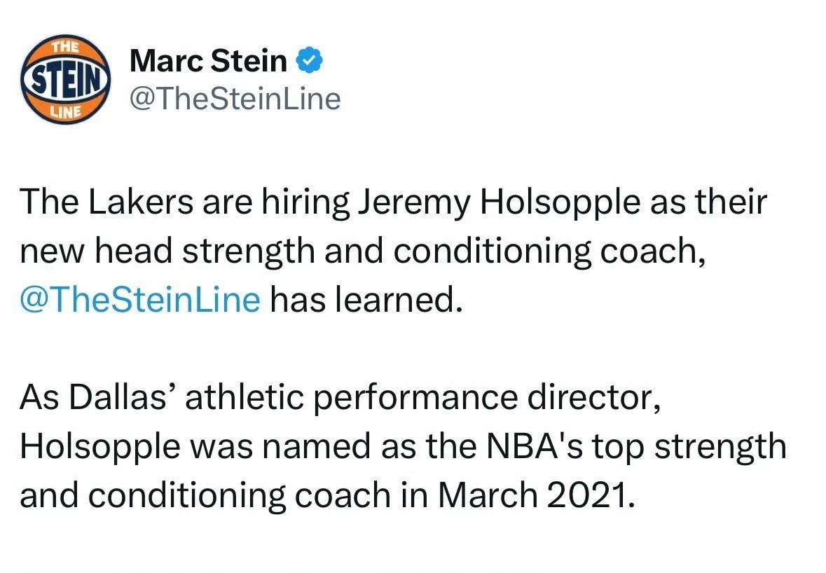 湖人官方宣布霍尔索普为球队运动表现总监! 据NBA记者MarcStein报道: