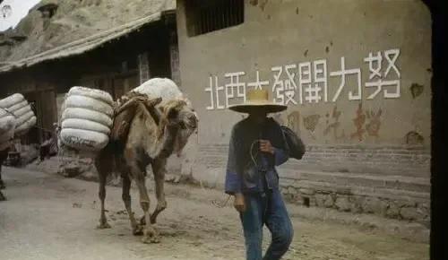 黄河铁桥附近,两峰骆驼,驮着沉重的羊毛货包,为美国记者摆了一个造型!甘肃的抗战,一部分功绩出自这些骆驼。一位骆驼客牵着驼队,驮着富华公司的羊毛,经过同样一个地方,墙壁上的 努力开发大西北 的标语,暗示这是一个不同寻常的年代。 这些驮载着羊毛的骆驼,它们将沿着丝绸之路,向西把羊毛送到新疆境内,然后再由其他工具接力送到苏联,最后被加工成大衣军毯等,或许莫斯科前线士兵的军毯大衣中的羊毛,就来自遥远的中国甘肃。 驼队在东返之时,又驮着苏联的武器 弹药 油料 甚至是飞机零件! 甘肃的驼队 大车,支撑起抗战基础!