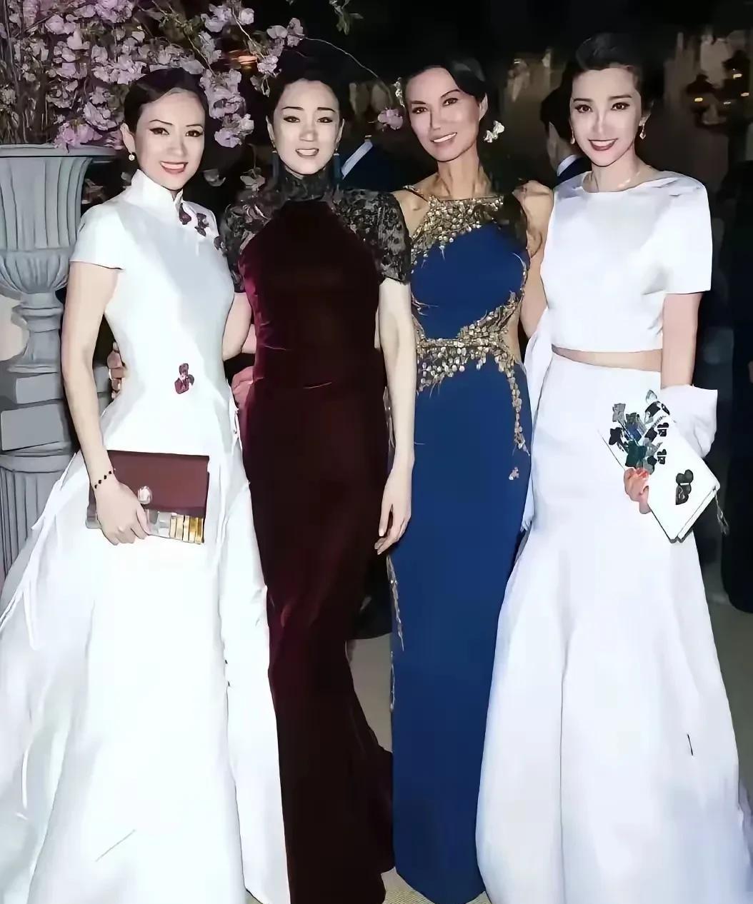 这是4位女明星的合影照,章子怡和李冰冰都身着白色衣服,手上拿着包包。巩俐一身酒红